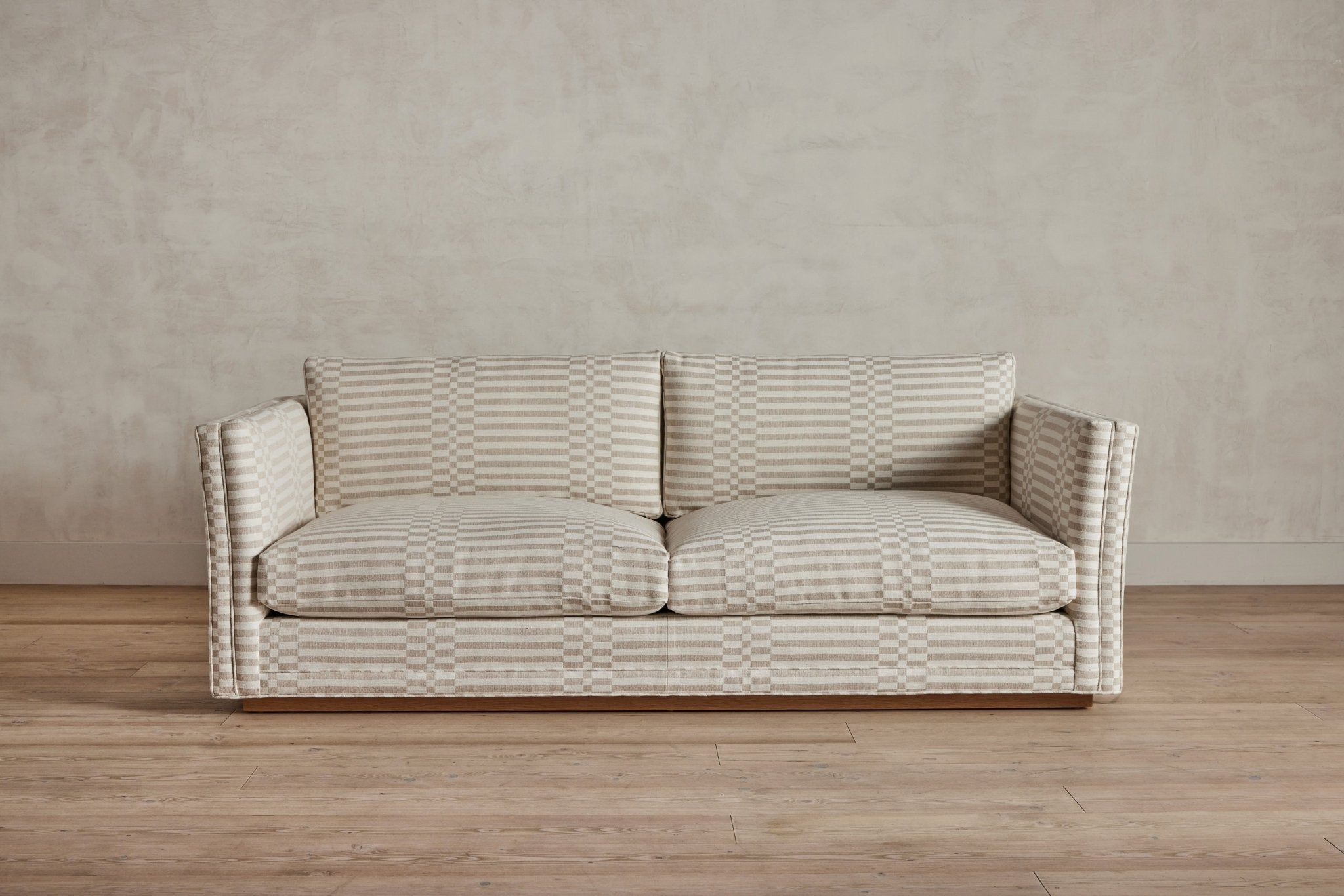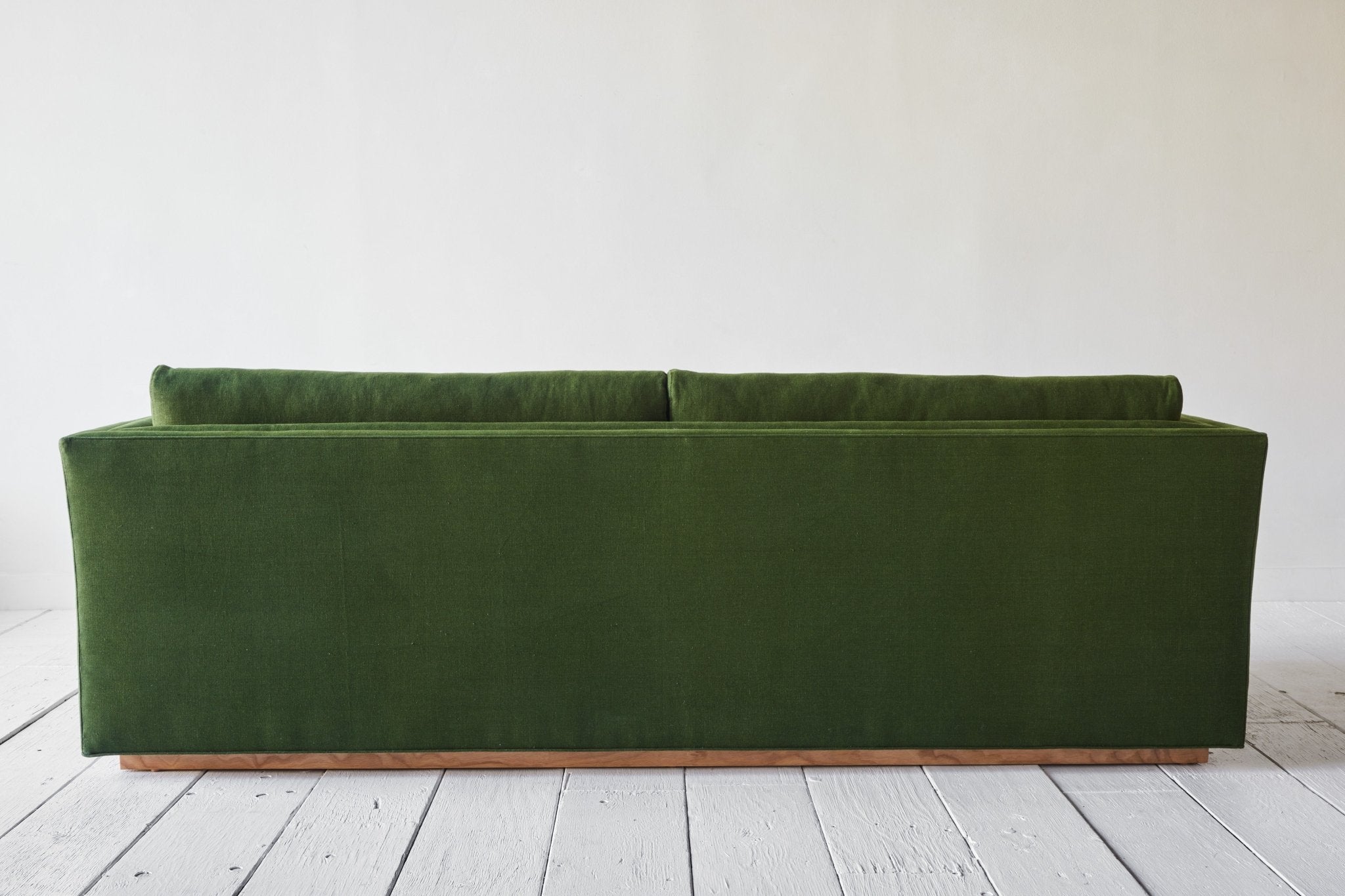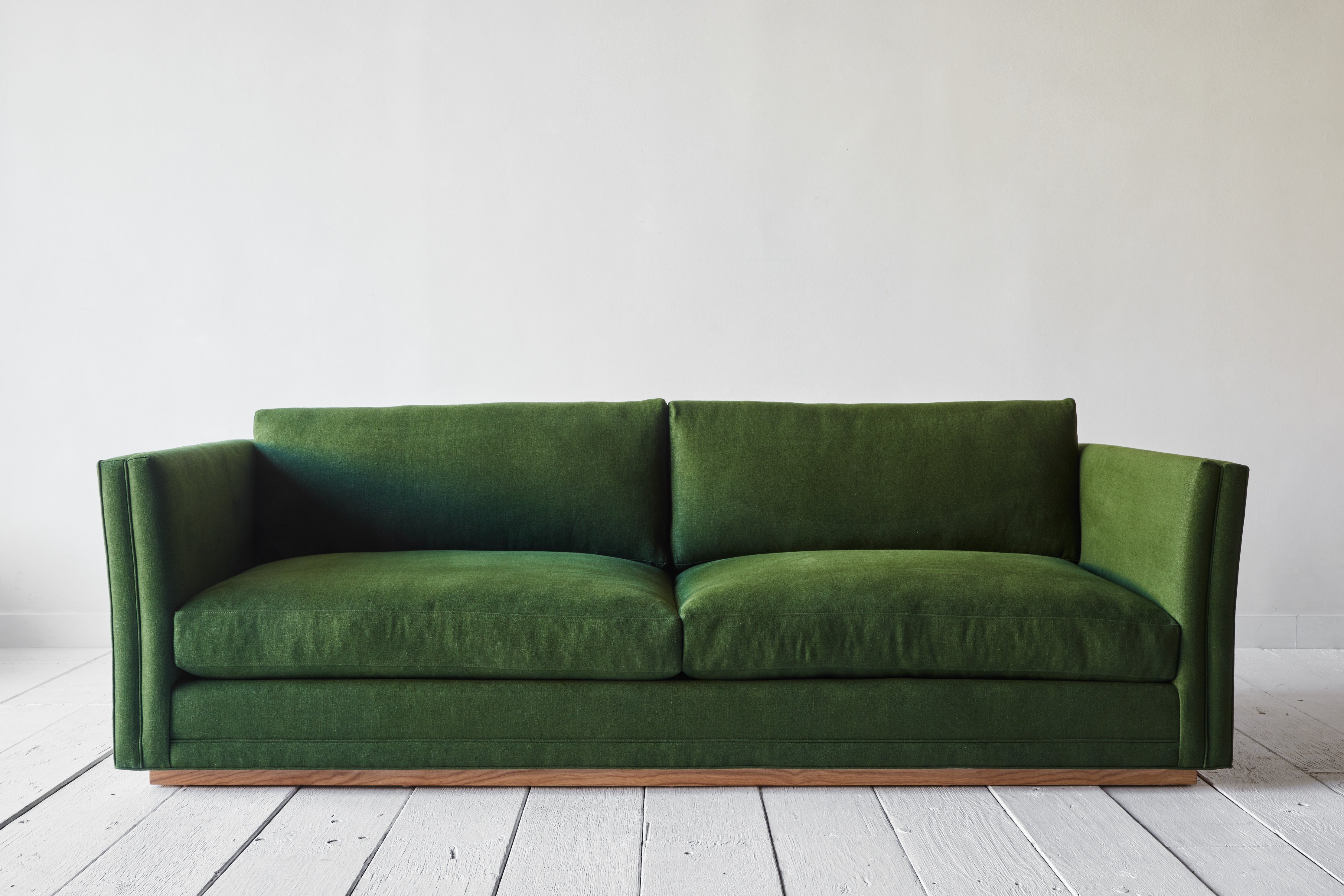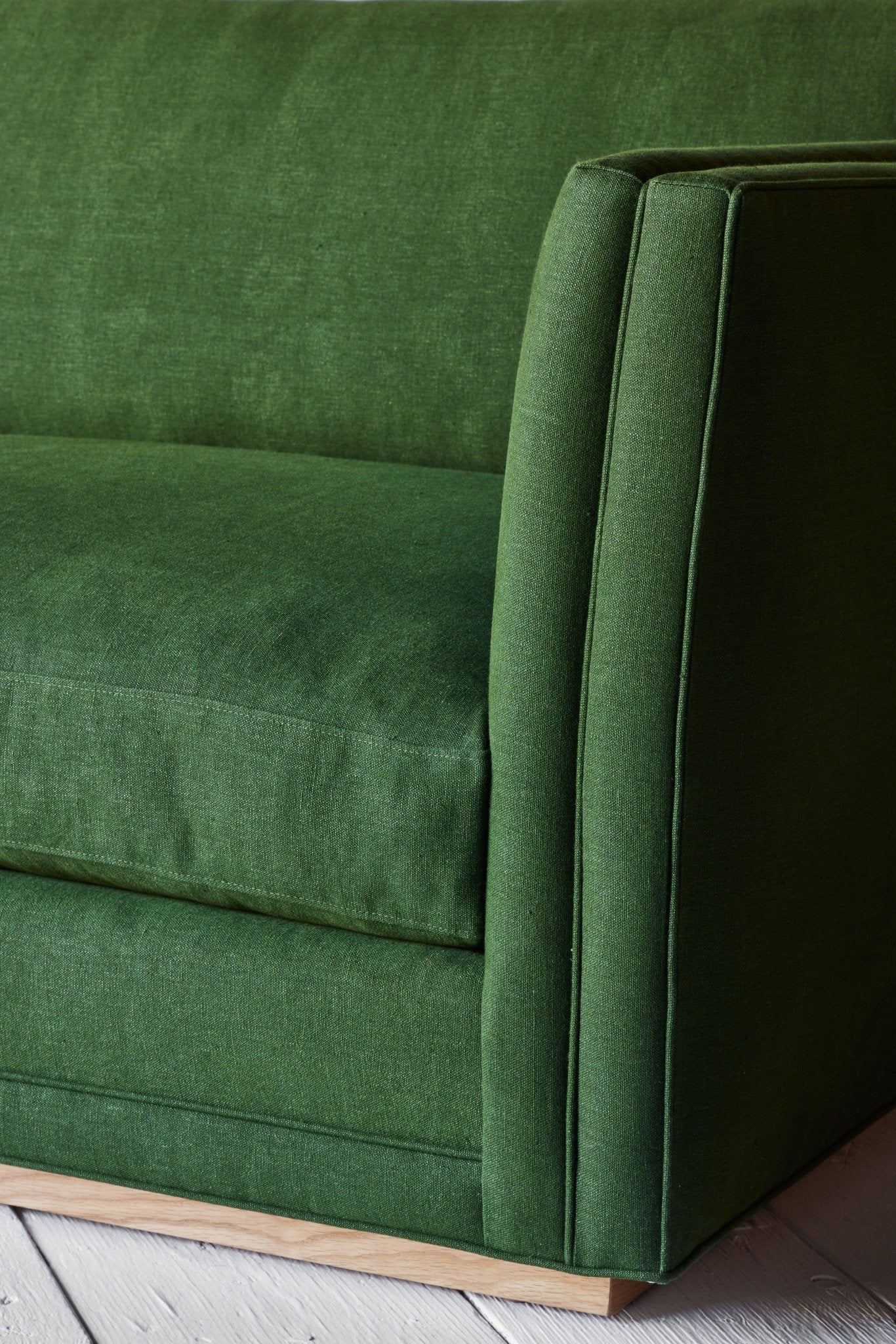 The gently flared arm of our favorite modern sofa creates a single elegant line, with generous depth in down-encased insets. A solid frame, precise piping and a recessed, shadow-base white oak plinth provide a sense of relaxed gravitas.