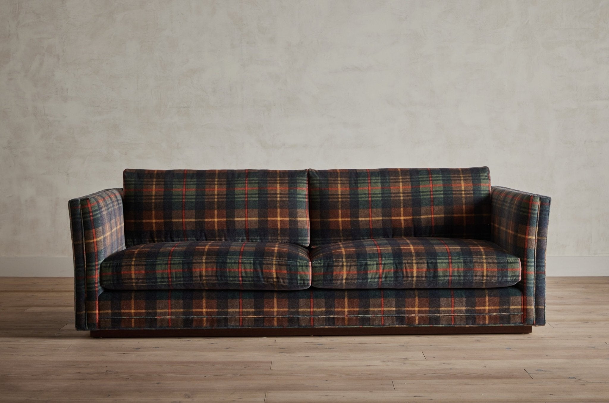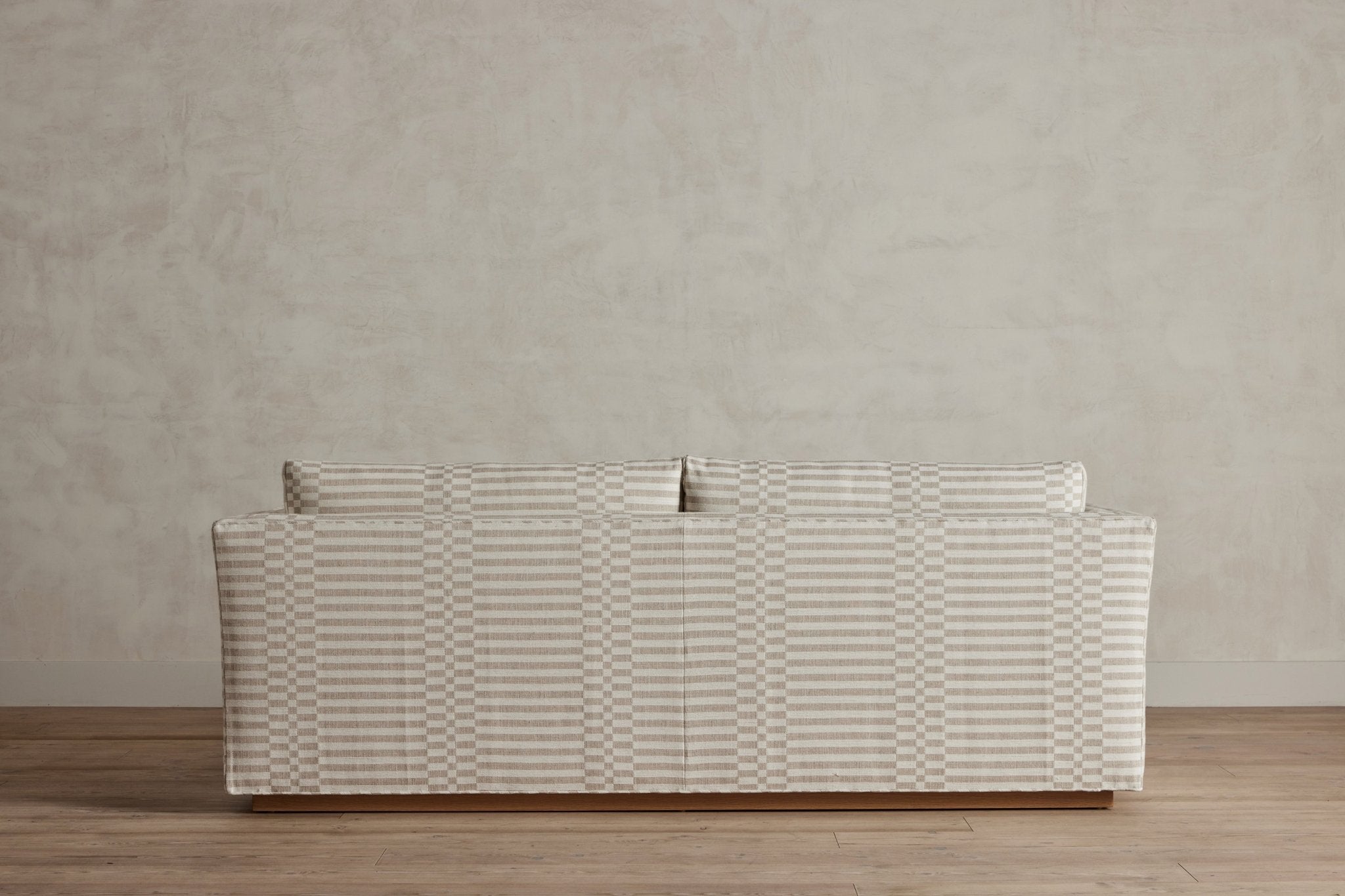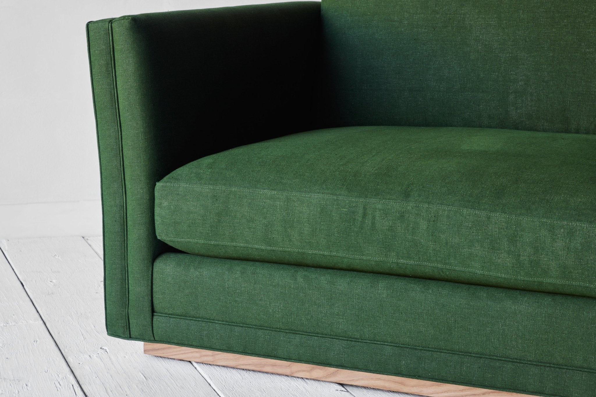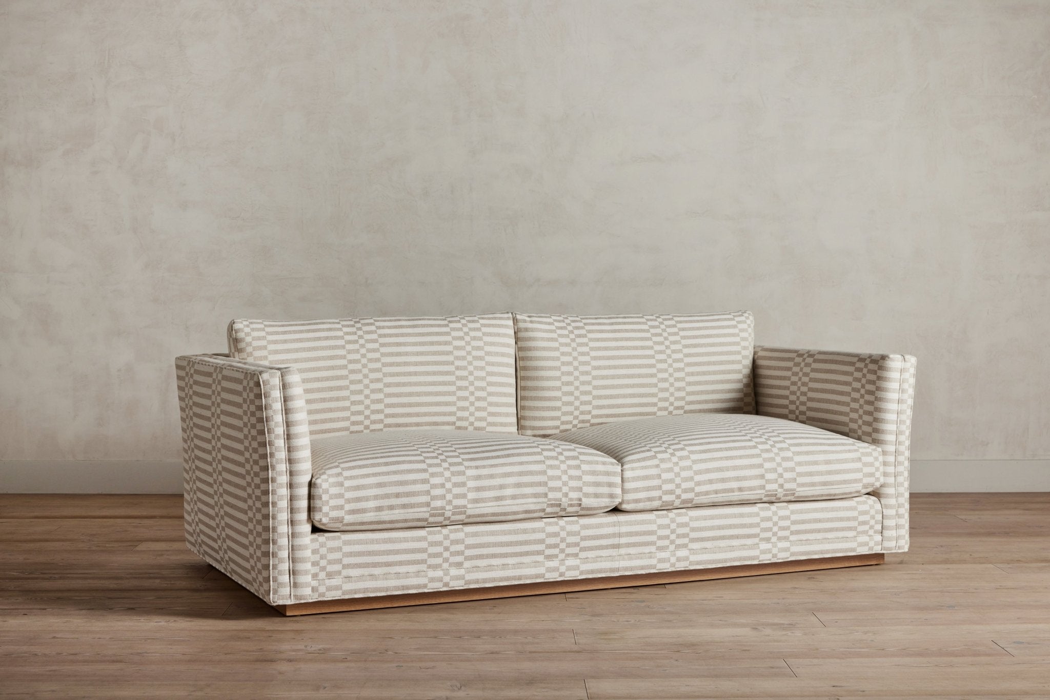 The gently flared arm of our favorite modern sofa creates a single elegant line, with generous depth in down-encased insets. A solid frame, precise piping and a recessed, shadow-base white oak plinth provide a sense of relaxed gravitas.