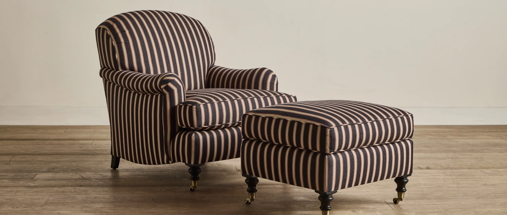 Shown in Howe Satin Stripe and Dark Oak with Matching Ottoman, Large Size