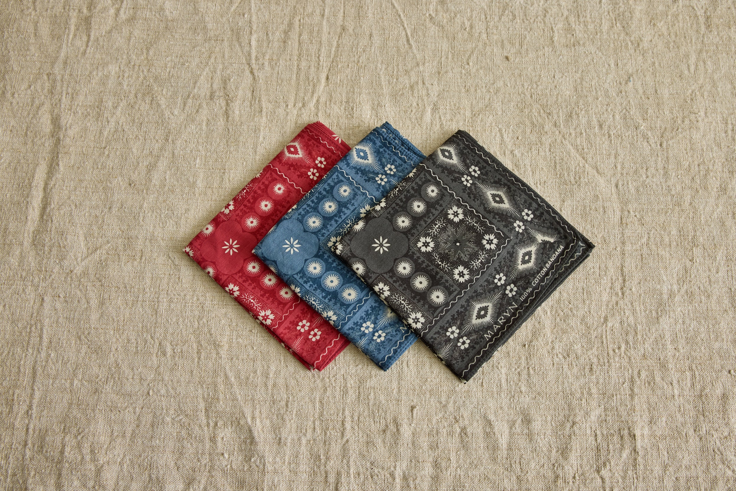 100% cotton lightweight cotton twill bandana. Finely woven and finished in Japan. Featuring an original pattern inspired by vintage textiles. Incredibly soft and  perfect to wear around your neck or tied in your hair. These rich colors will only get better with time and use. Available in three colors, sold individually.