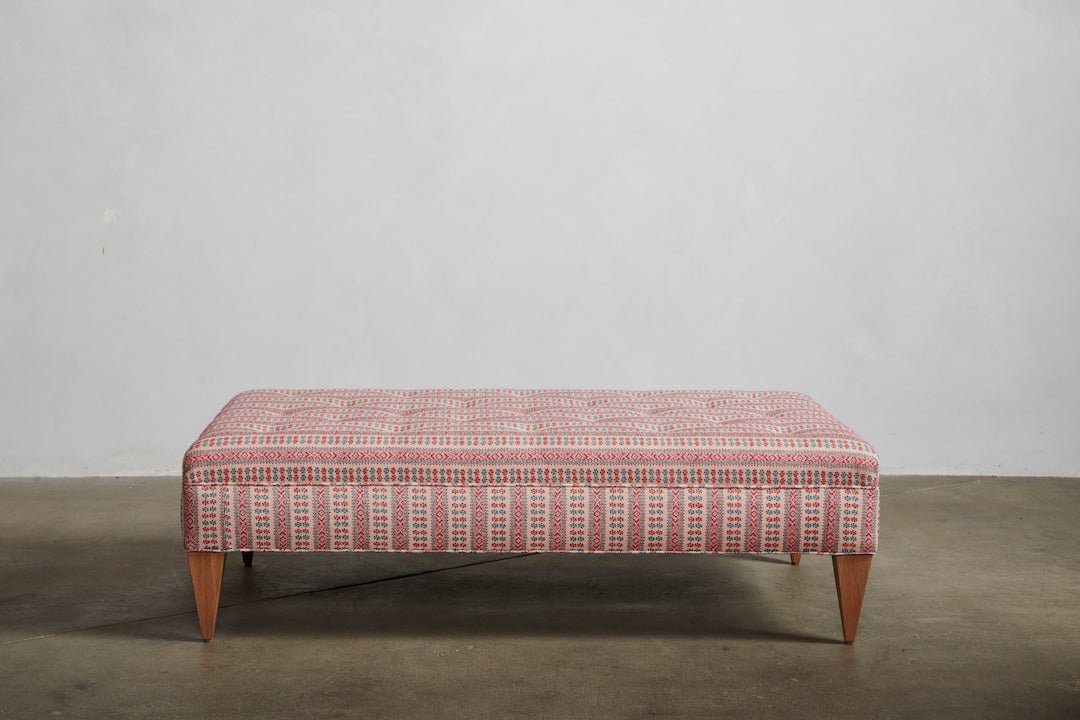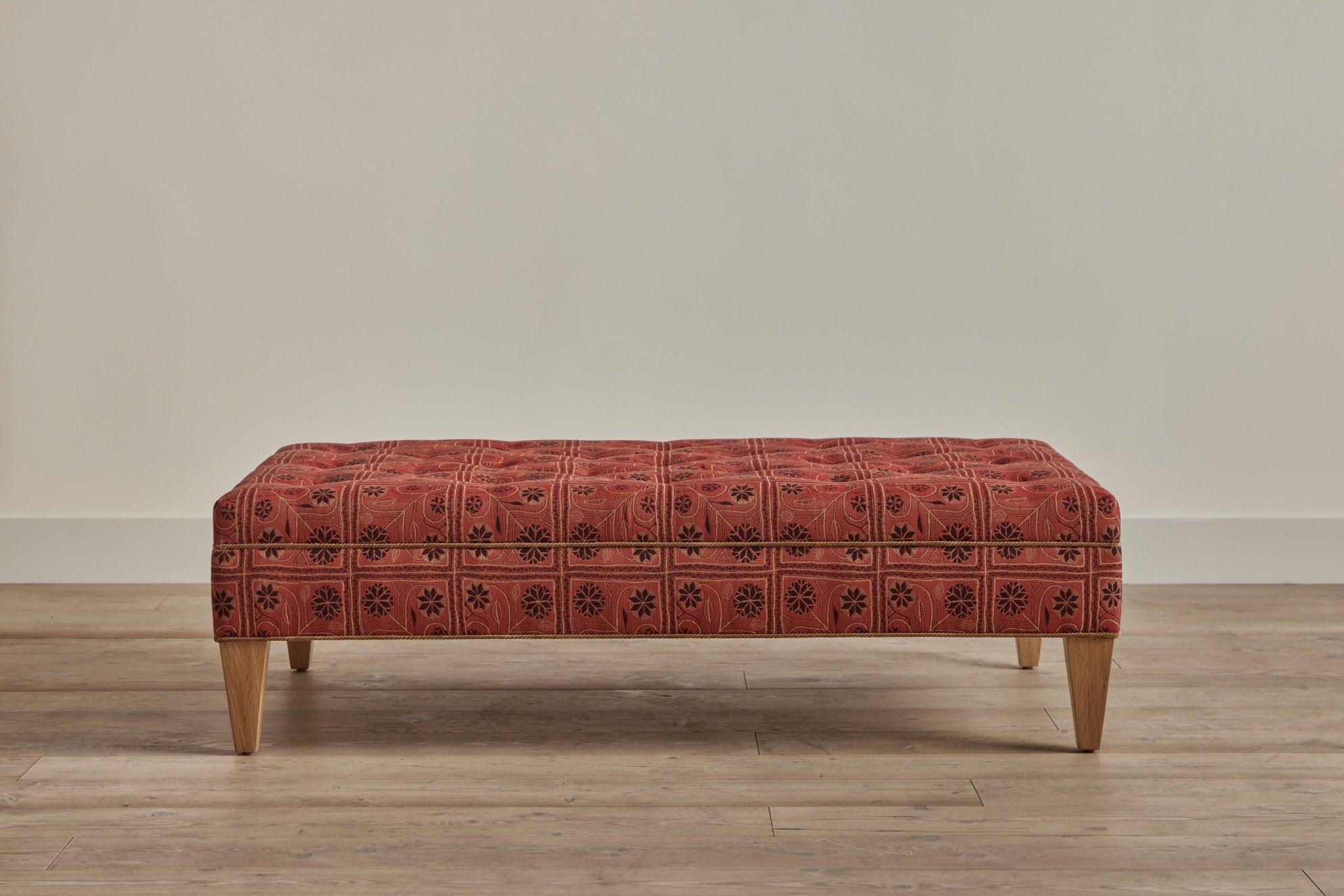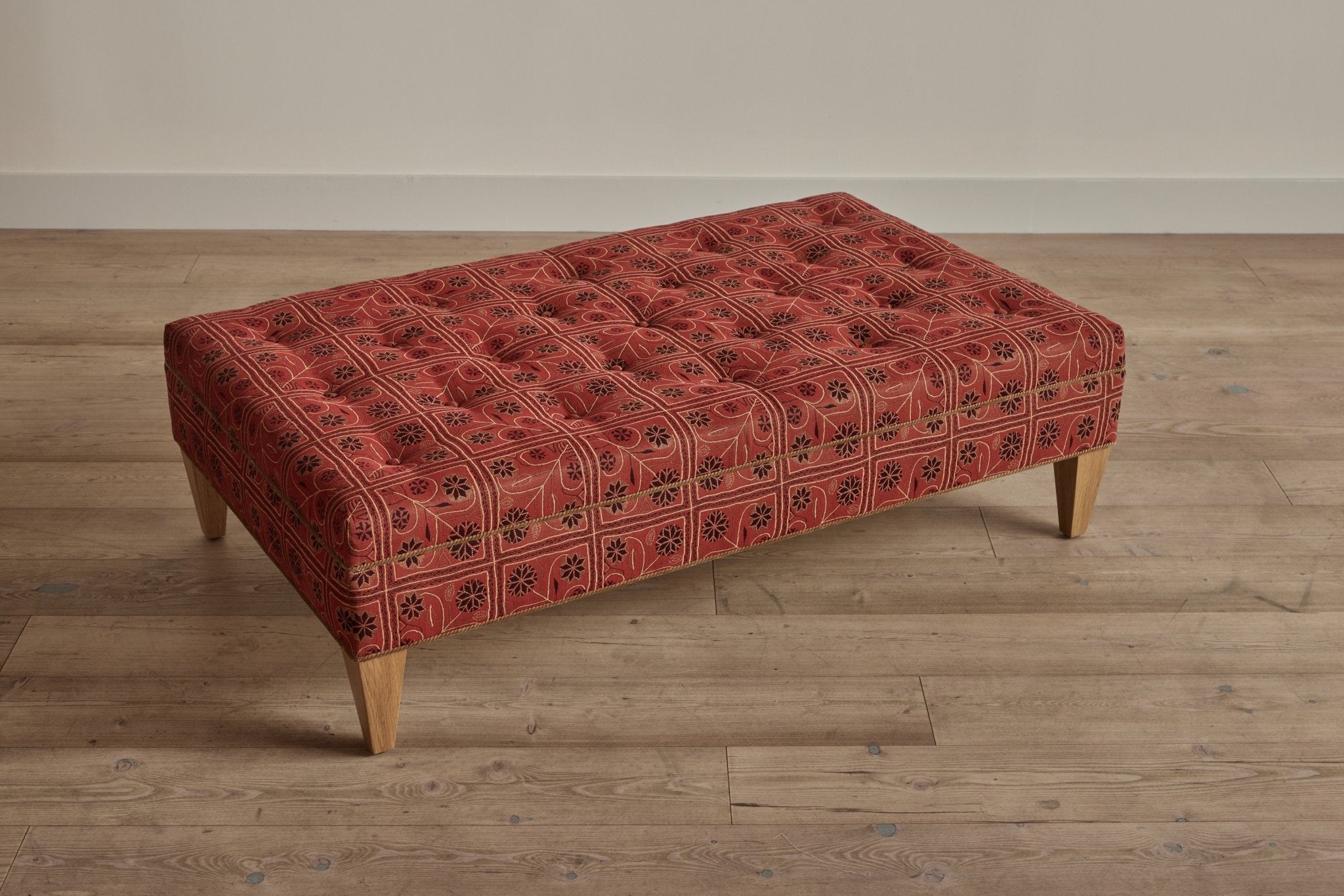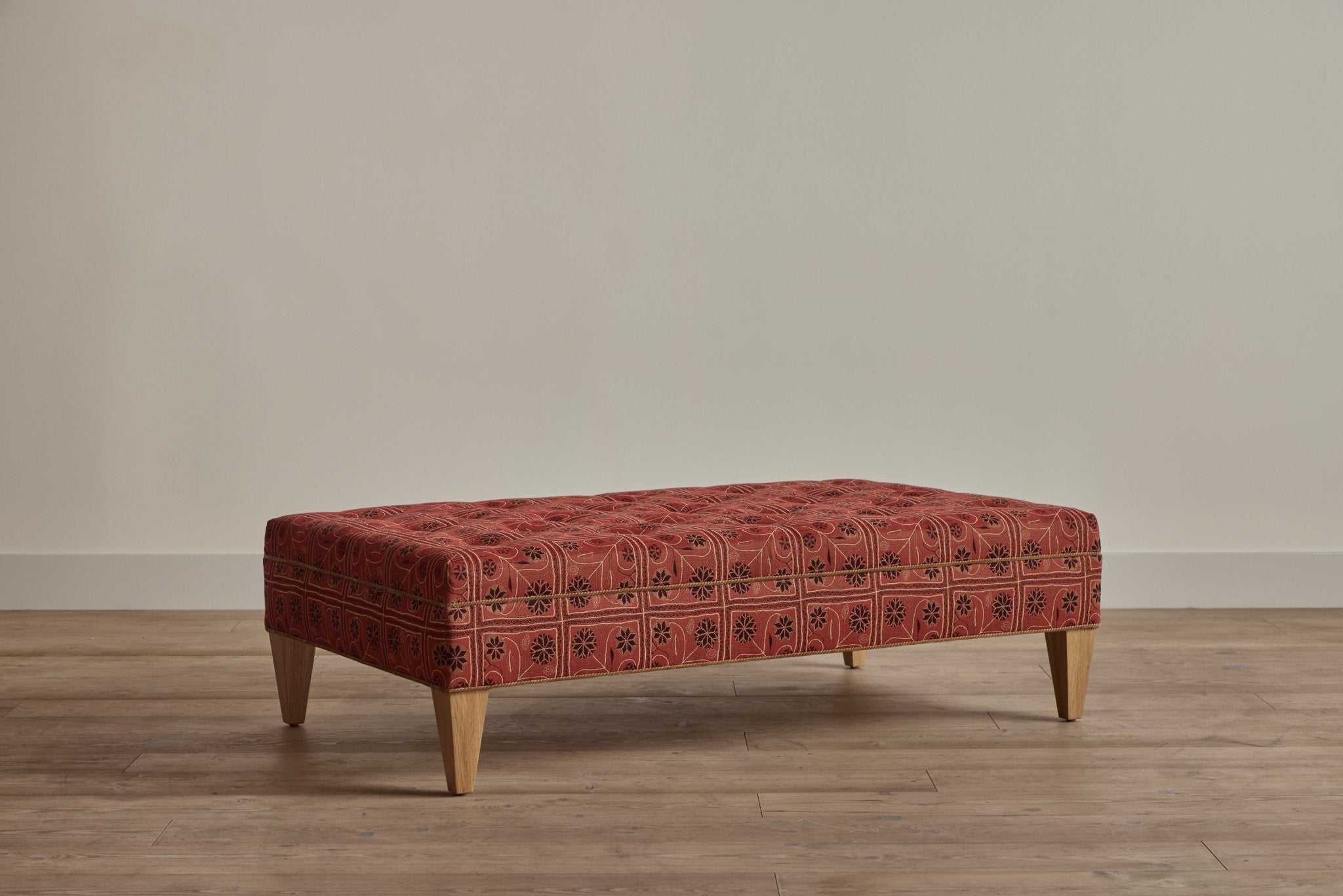 This clever little upholstered ottoman gives a hint of rococo glam with deep tufts and square tapered white oak legs. A curiously beautiful alternative to a traditional coffee or side table, it is designed to fit your needs, from a living room accent piece to a fireside staple. Customized upon request.