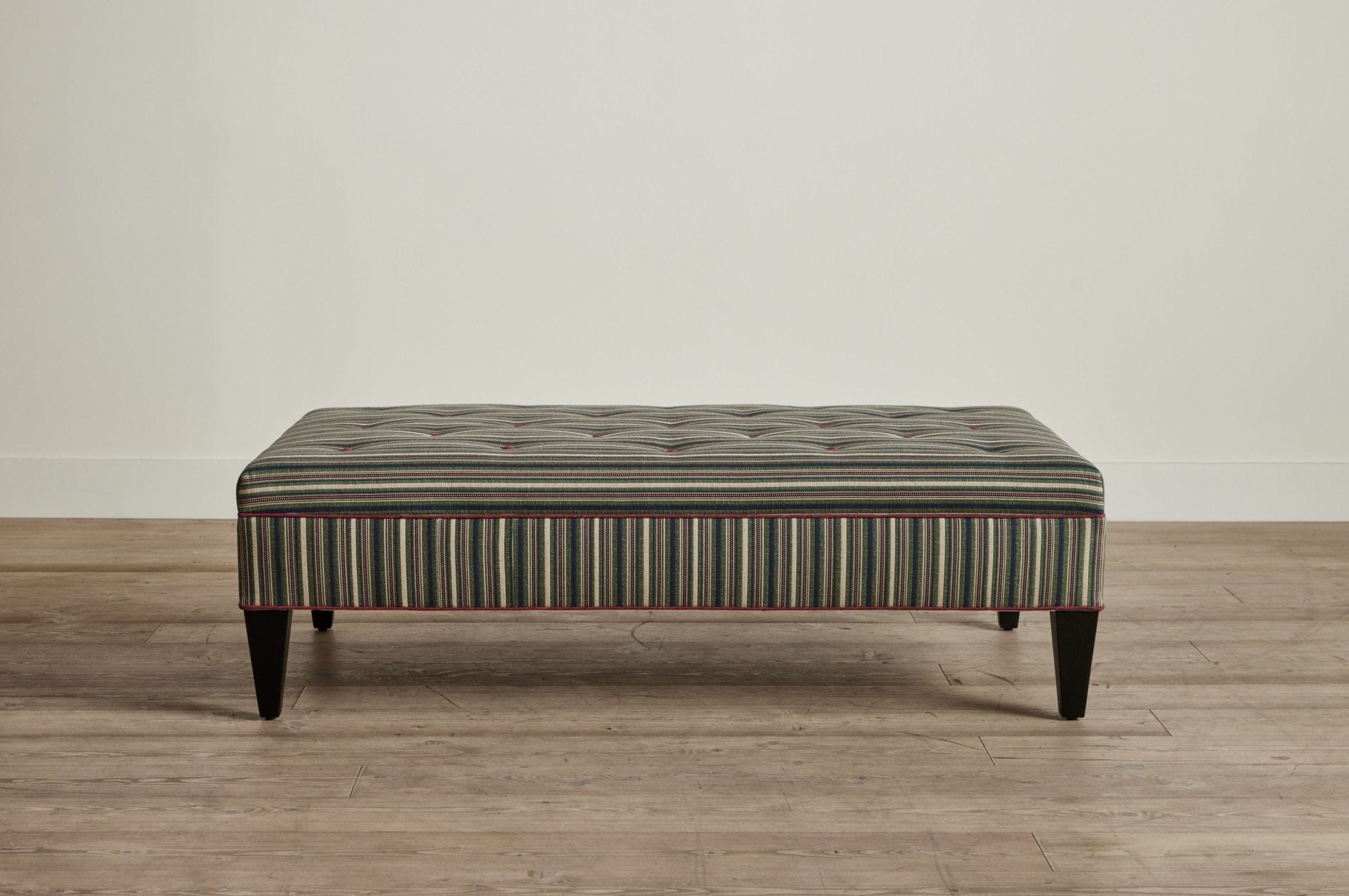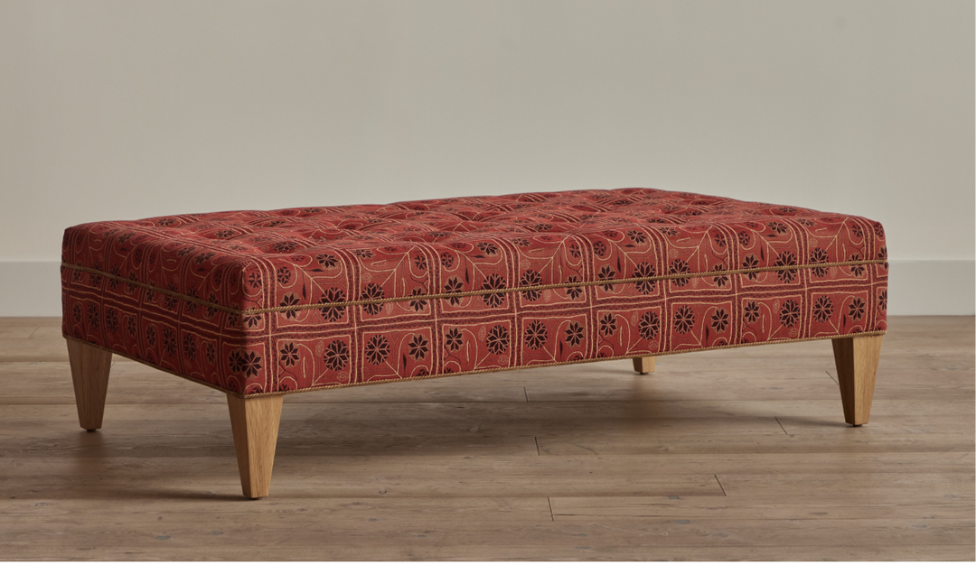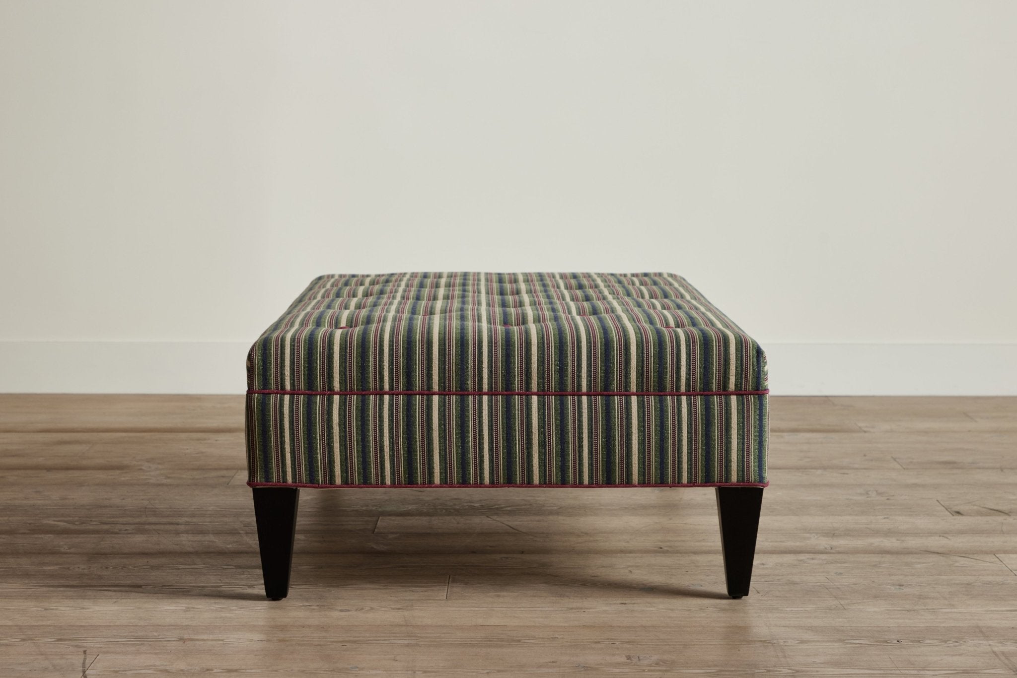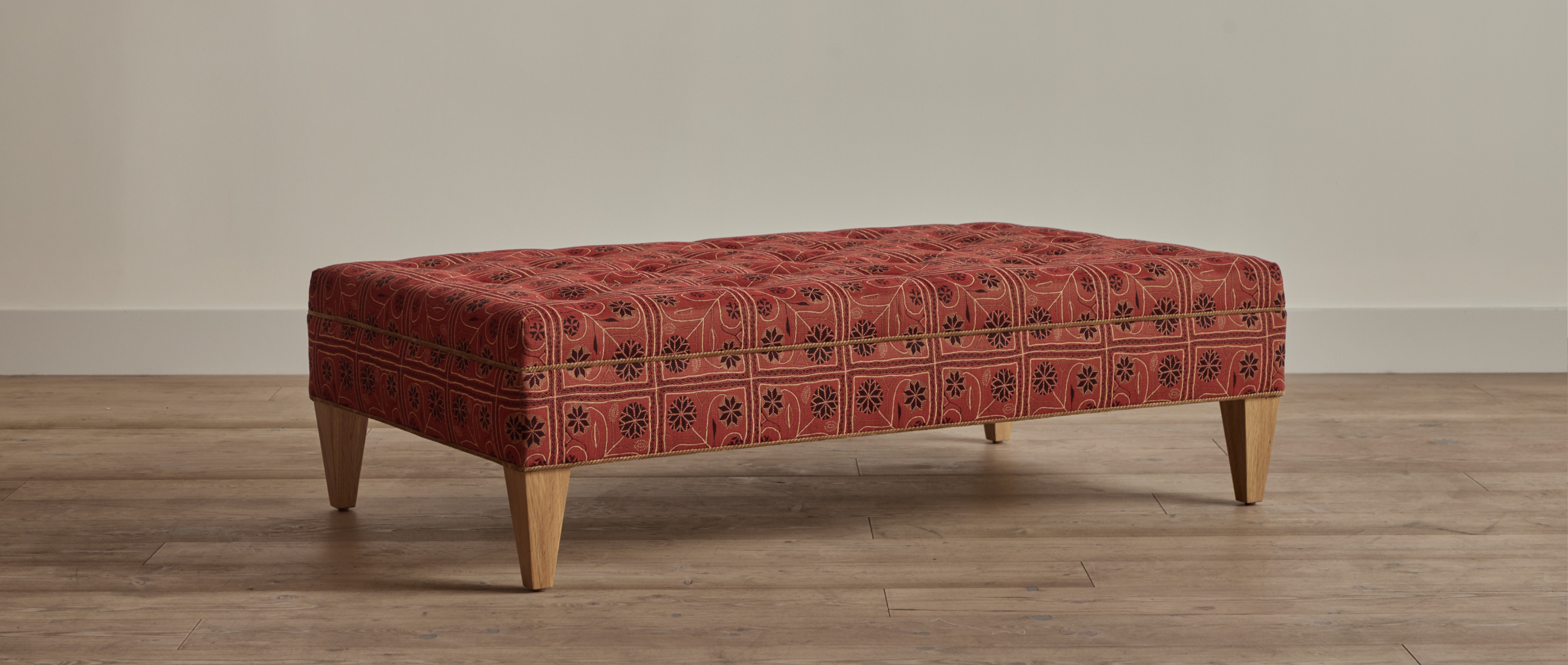 This clever little upholstered ottoman gives a hint of rococo glam with deep tufts and square tapered white oak legs. A curiously beautiful alternative to a traditional coffee or side table, it is designed to fit your needs, from a living room accent piece to a fireside staple. Customized upon request.