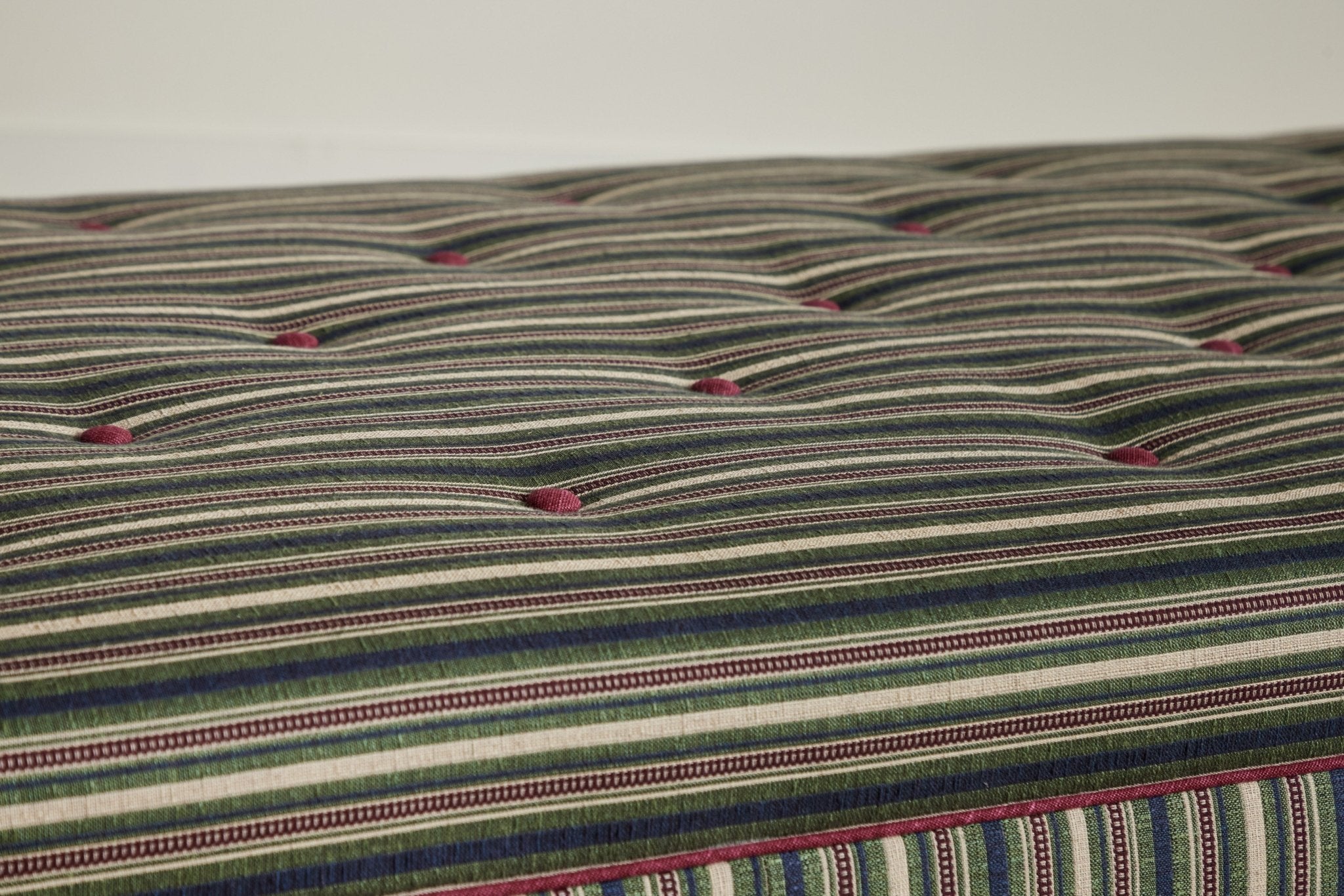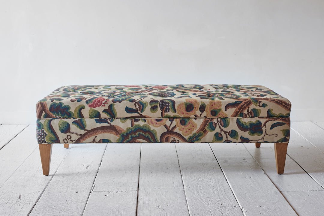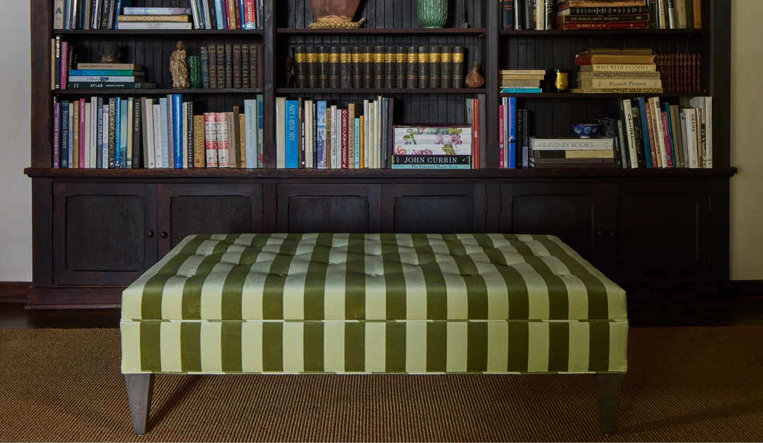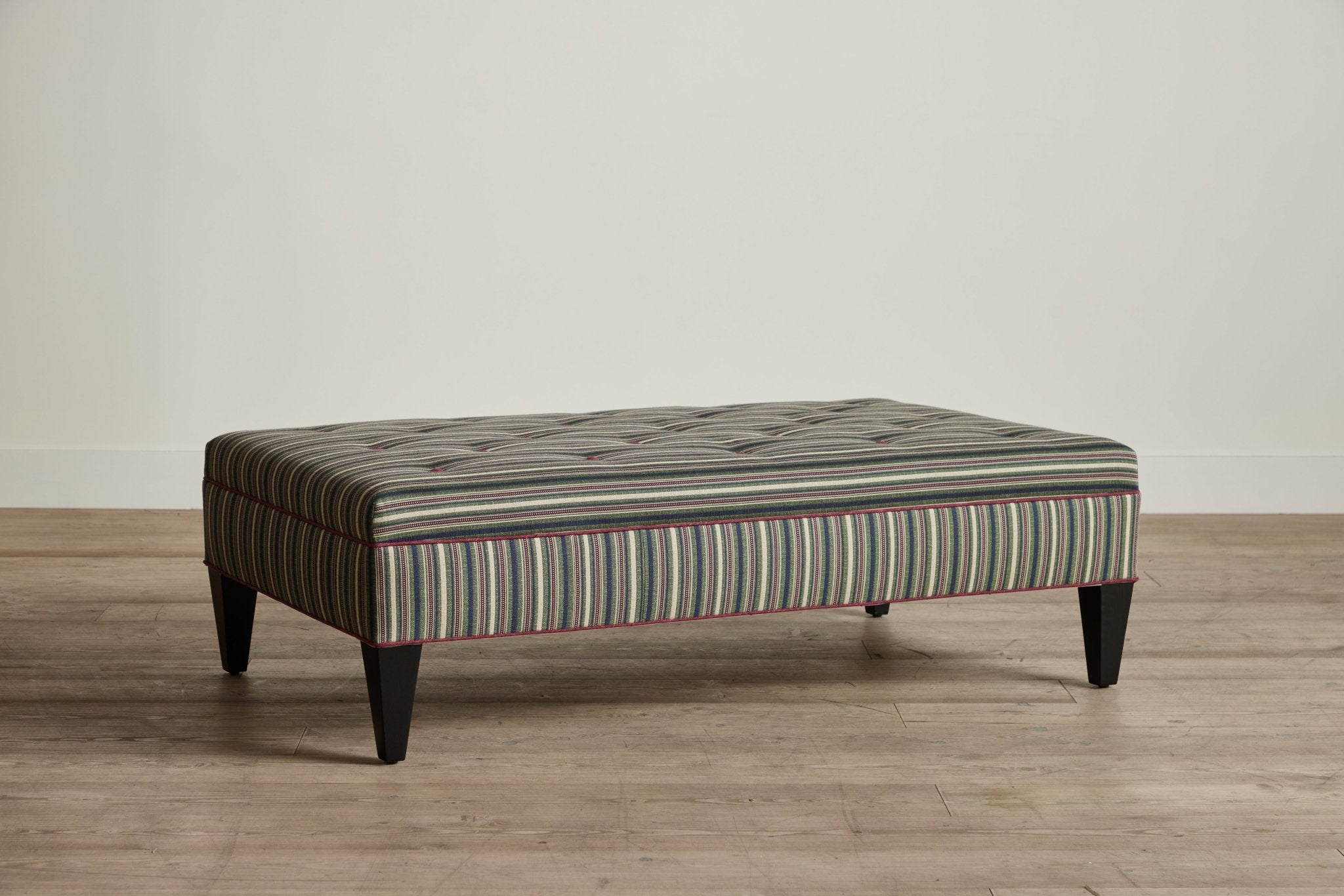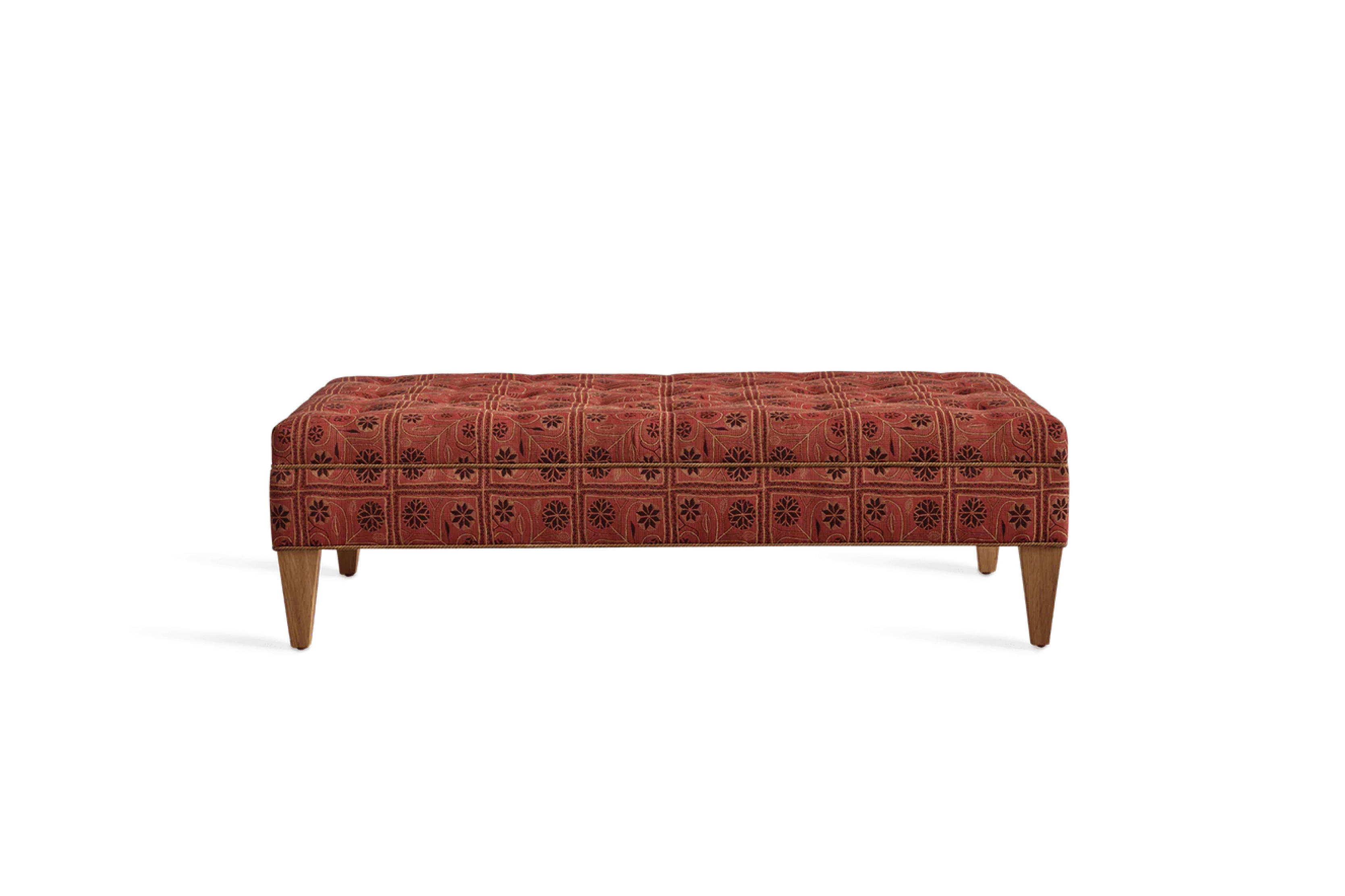 This clever little upholstered ottoman gives a hint of rococo glam with deep tufts and square tapered white oak legs. A curiously beautiful alternative to a traditional coffee or side table, it is designed to fit your needs, from a living room accent piece to a fireside staple. Customized upon request.