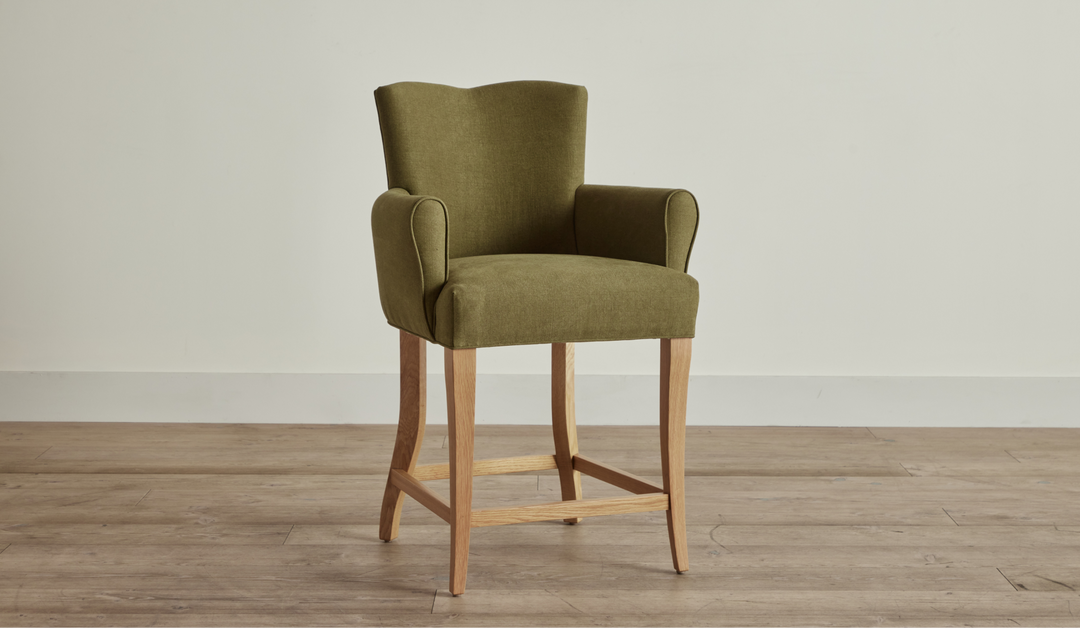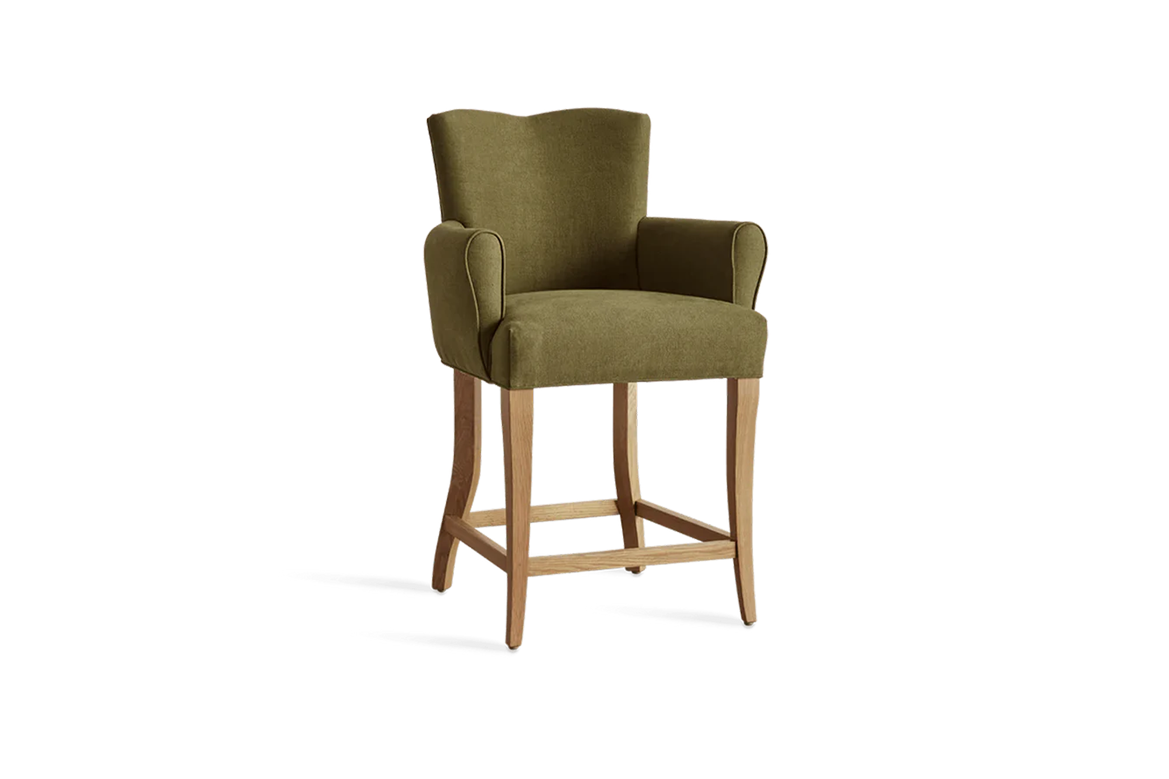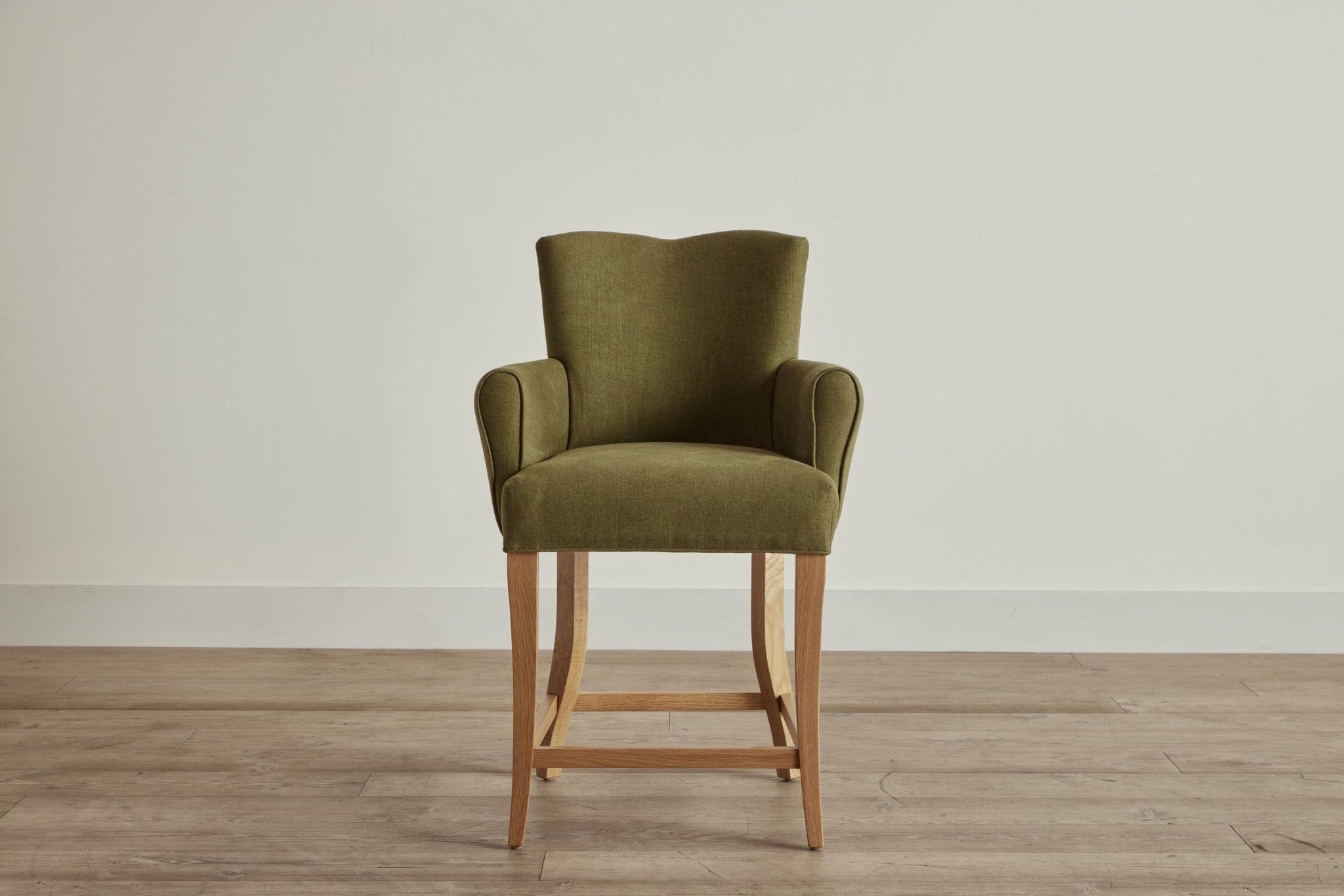 A counter stool version of our NK Club Dining Chair. Inspired by the classic game chair, this natural oak stool balances curved white oak legs and gently sloping arms with a strongly defined seat back and fine-tuned pitch. Perfect for kitchen islands or bars, it invites spontaneous entertaining and moments of relaxation in high, yet low-key style. Choose a designer-selected finish, custom painted legs, tailored self-welting or contrast piping.