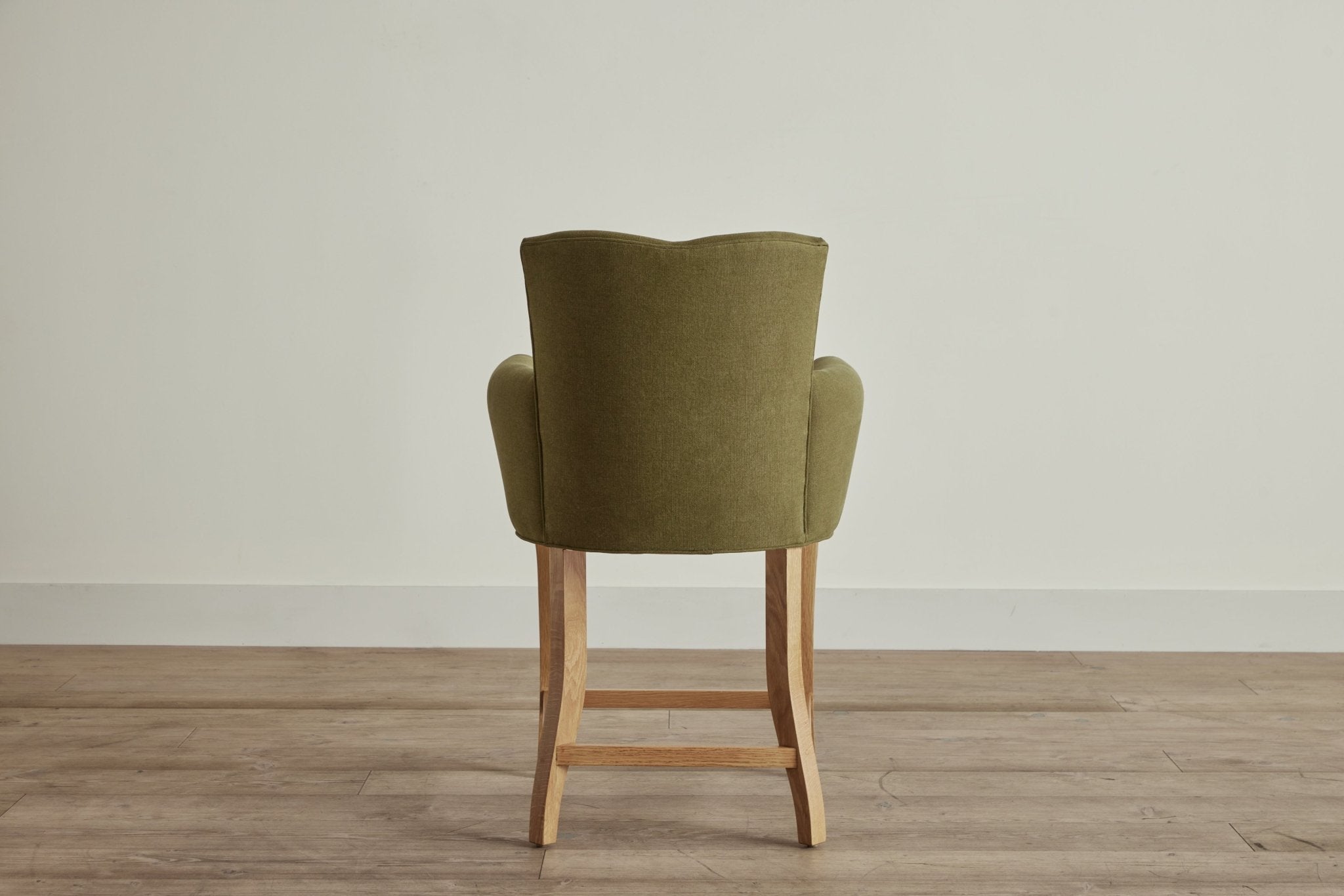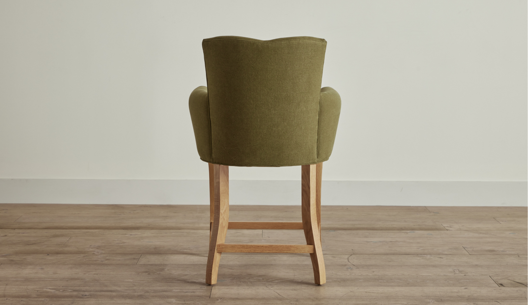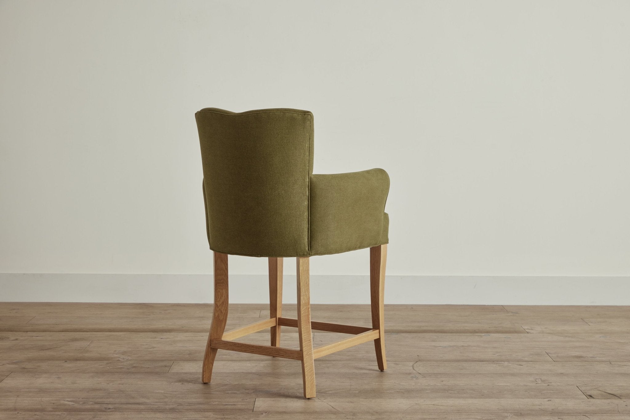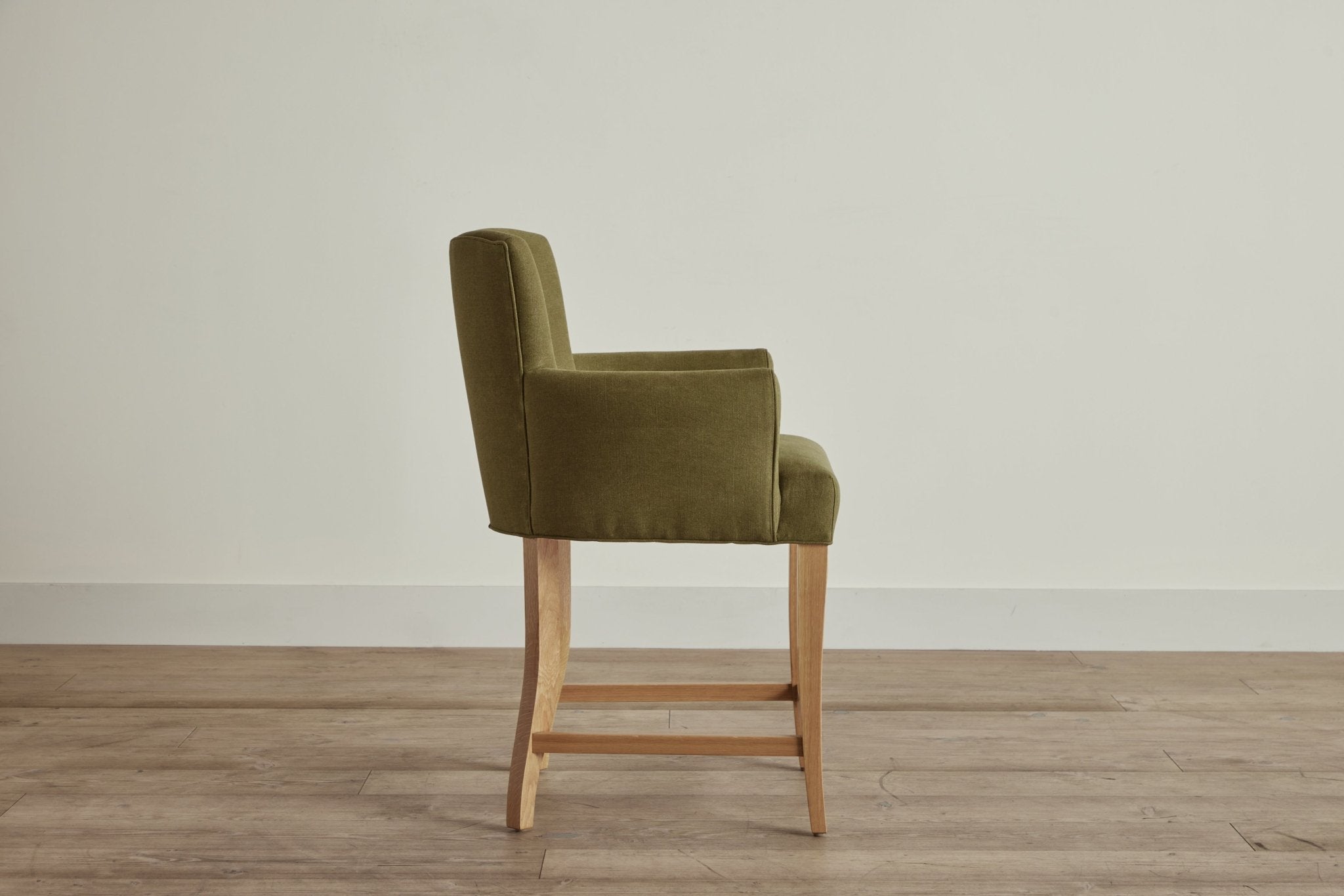 A counter stool version of our NK Club Dining Chair. Inspired by the classic game chair, this natural oak stool balances curved white oak legs and gently sloping arms with a strongly defined seat back and fine-tuned pitch. Perfect for kitchen islands or bars, it invites spontaneous entertaining and moments of relaxation in high, yet low-key style. Choose a designer-selected finish, custom painted legs, tailored self-welting or contrast piping.