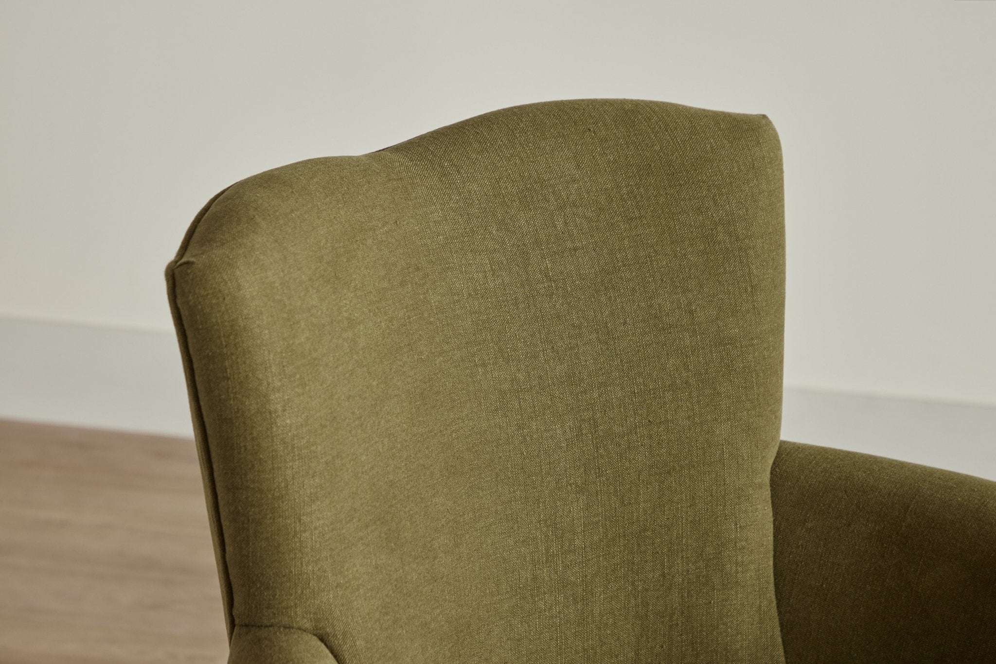 Shown in Customer's Own Material (Libeco Stonewashed Linen in Moss) and Natural Oak