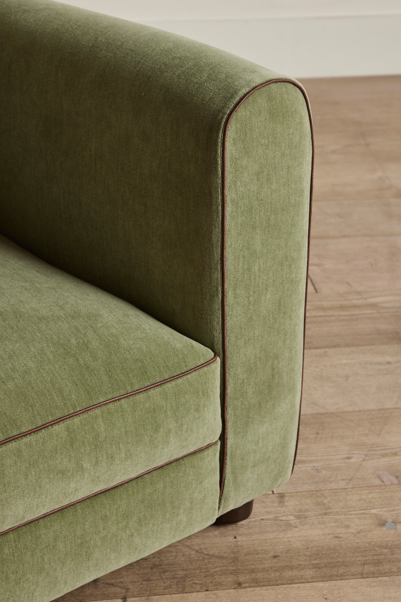 Shown in Customer's Own Material (Holland & Sherry Rambouillet Basil with Howe Leather Piping In Tobacco) and Dark Oak