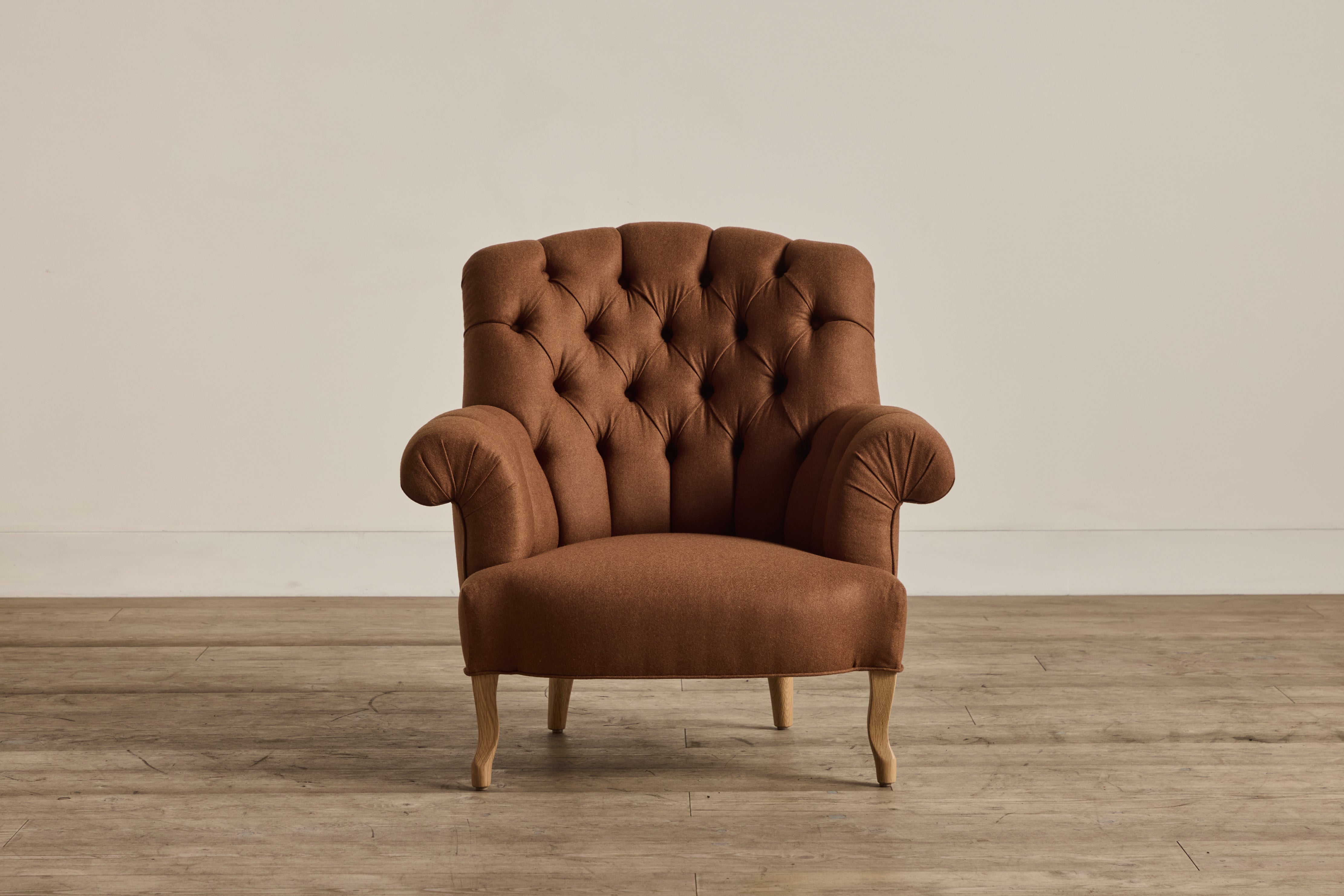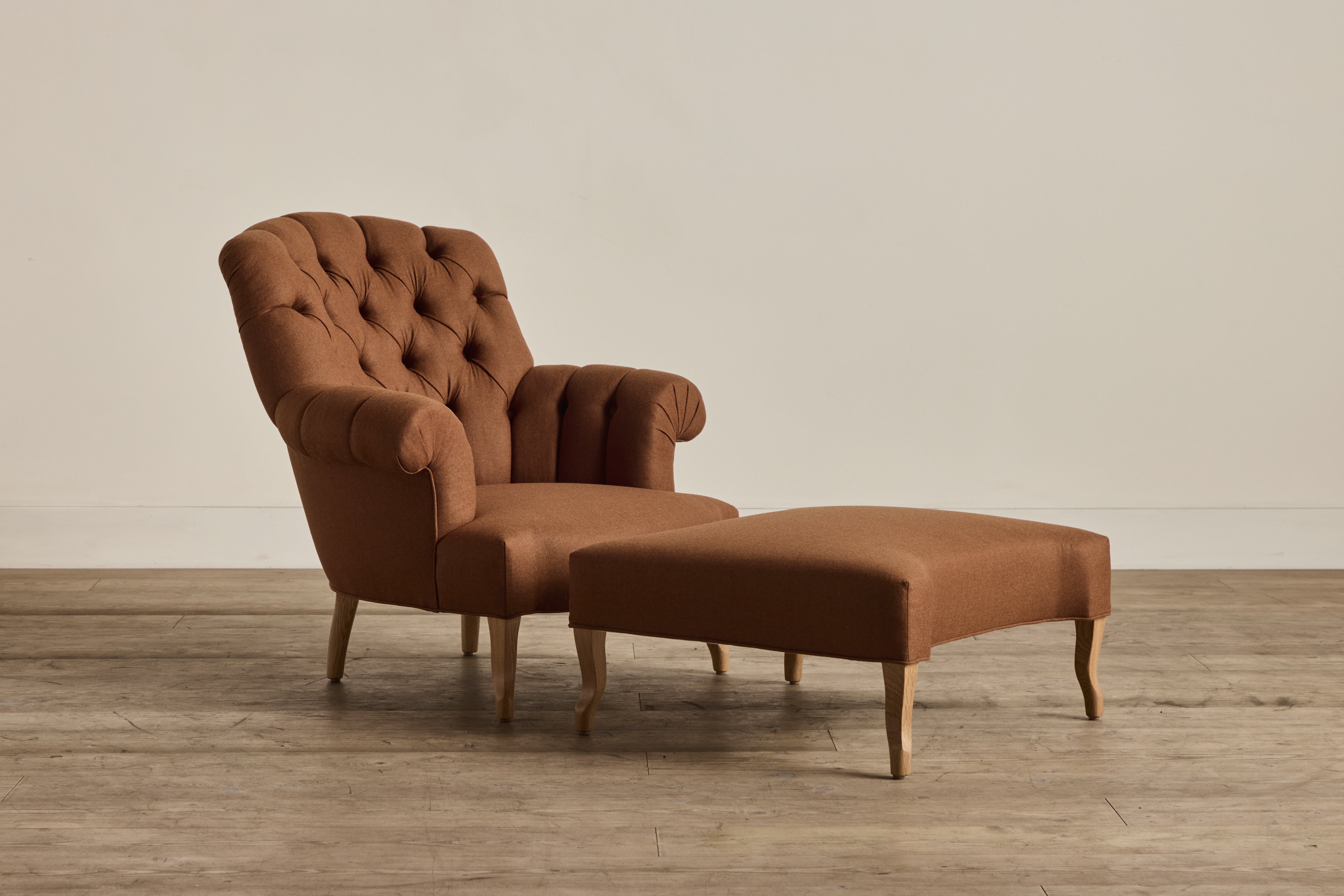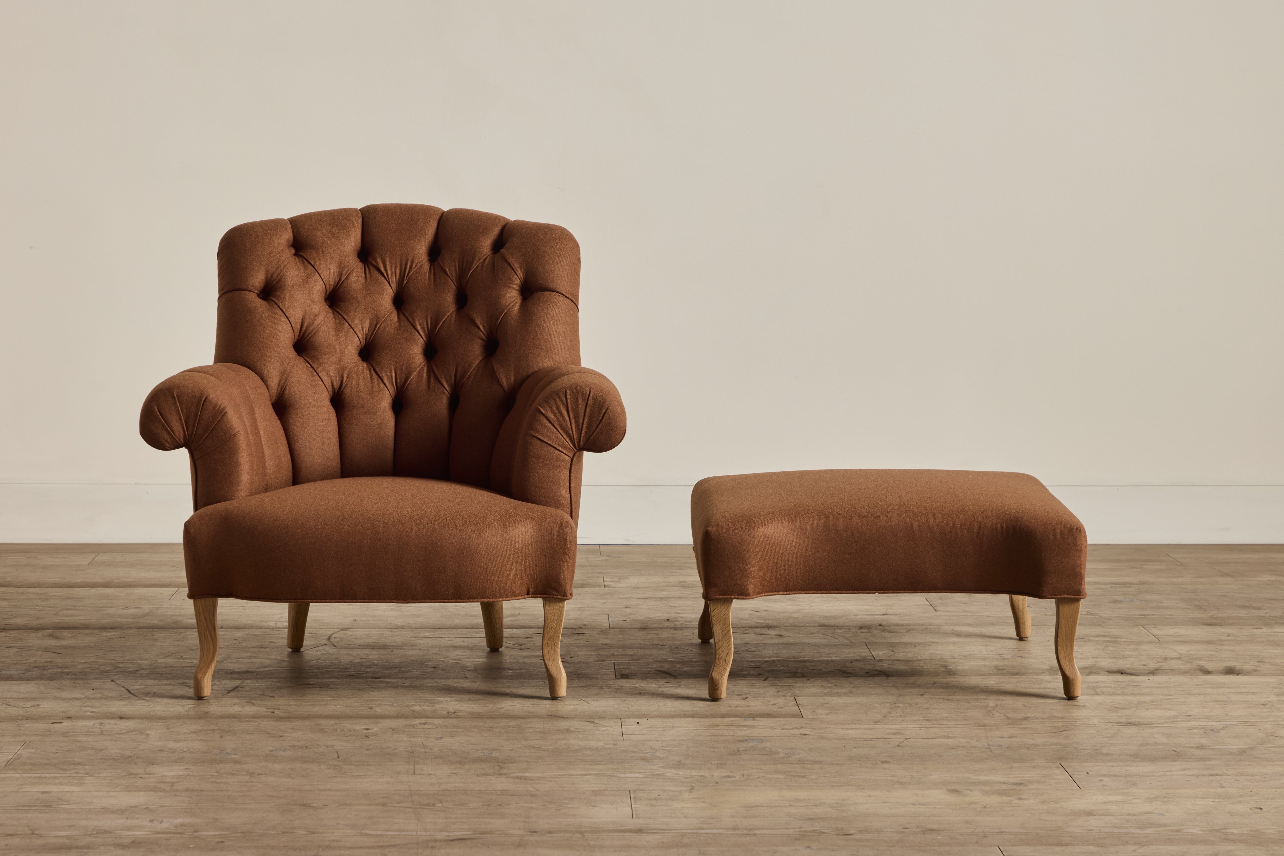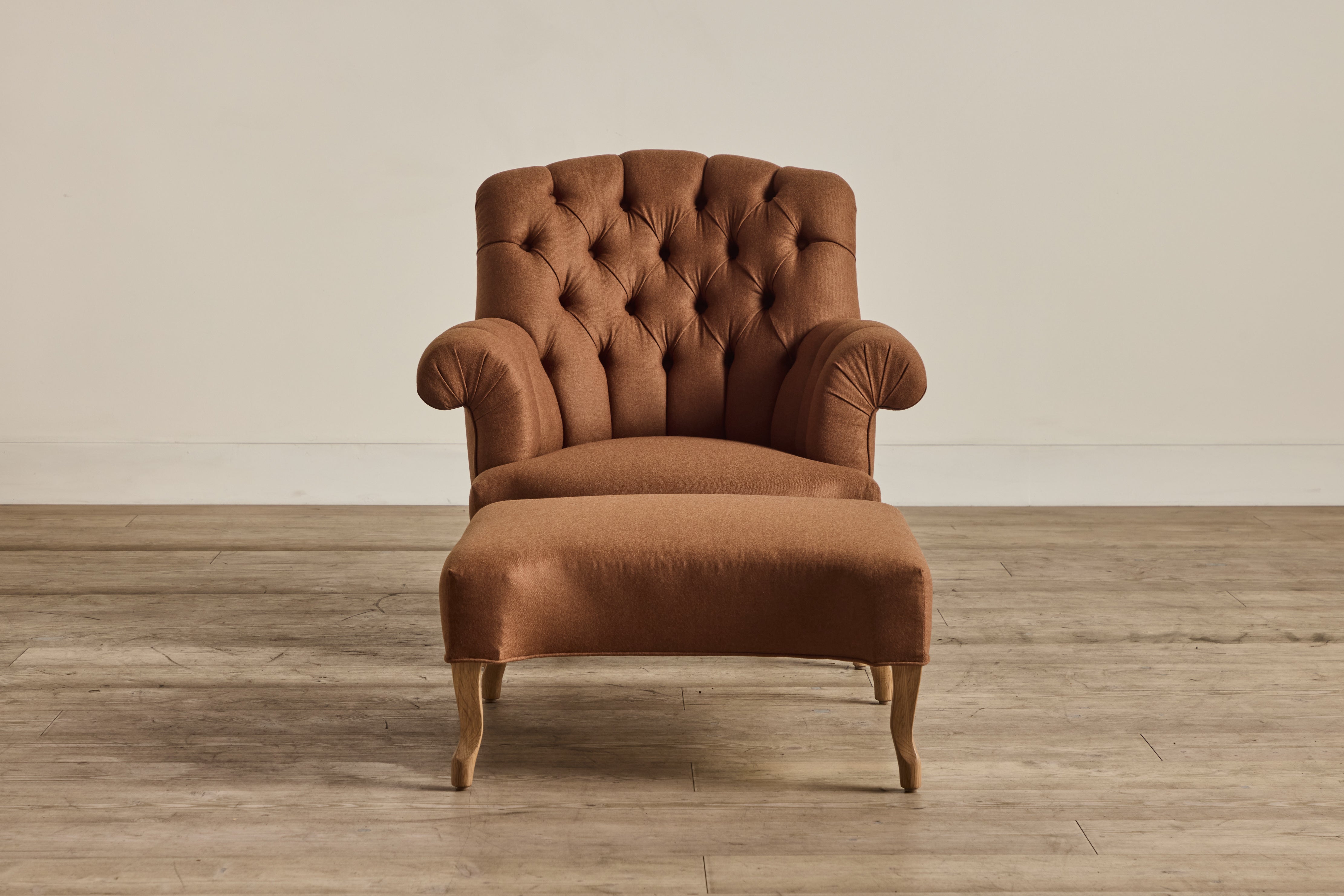 A true heirloom piece. Delightfully feminine as much as it is masculine, this distinct take on a traditional armchair imposes a great presence with a modest footprint. The button-tufted seat back sits upright while leaving plenty of room for comfortable repose. Pair with the matching Library Ottoman for even longer hours of lounging.