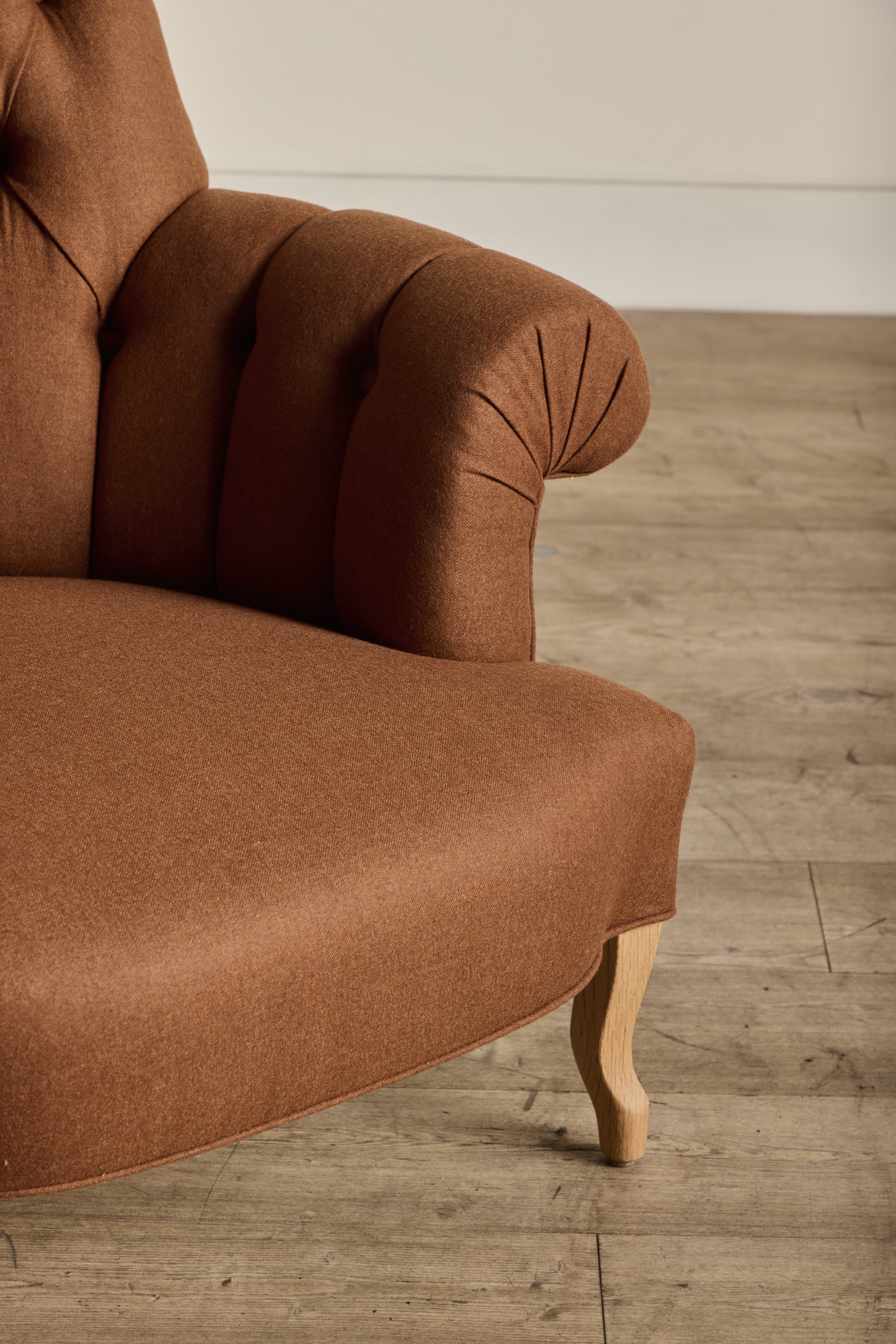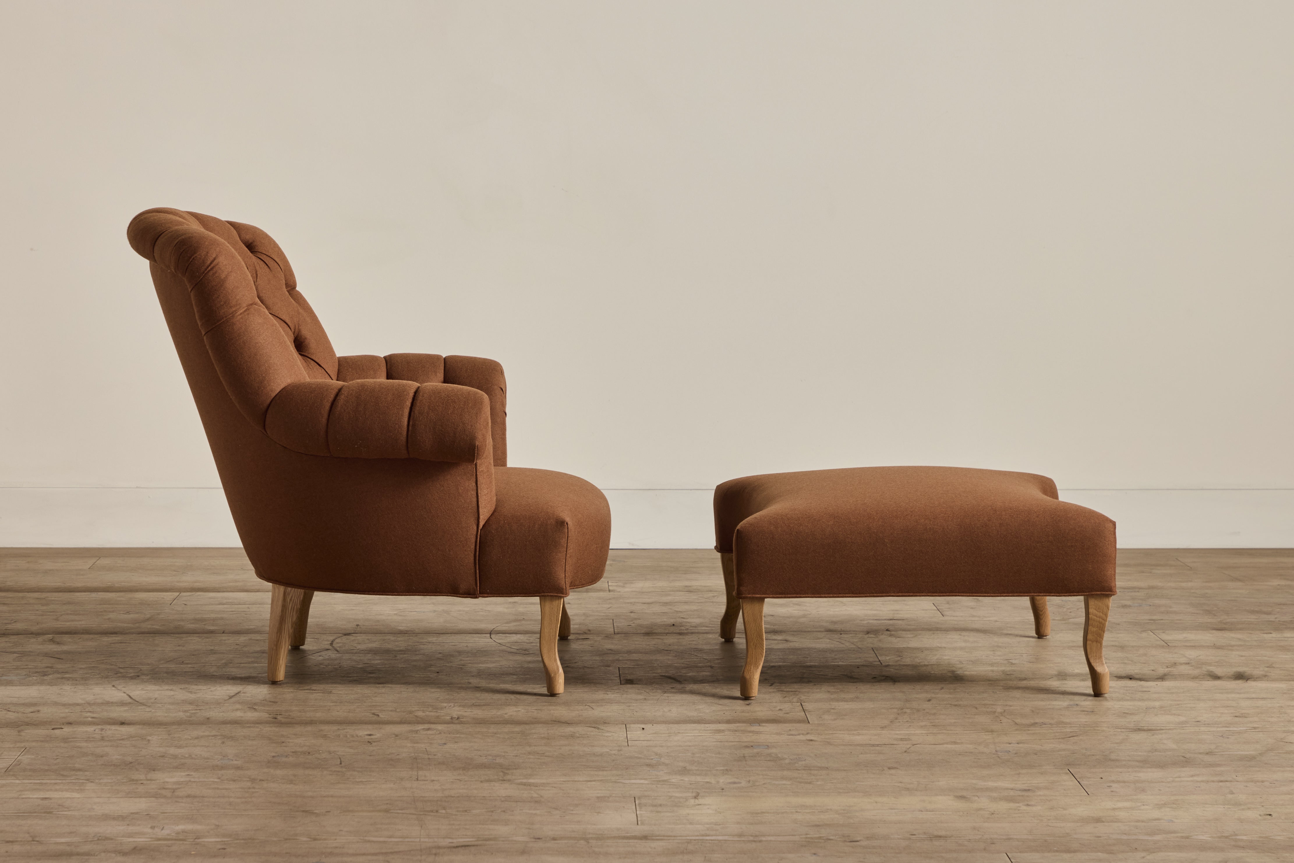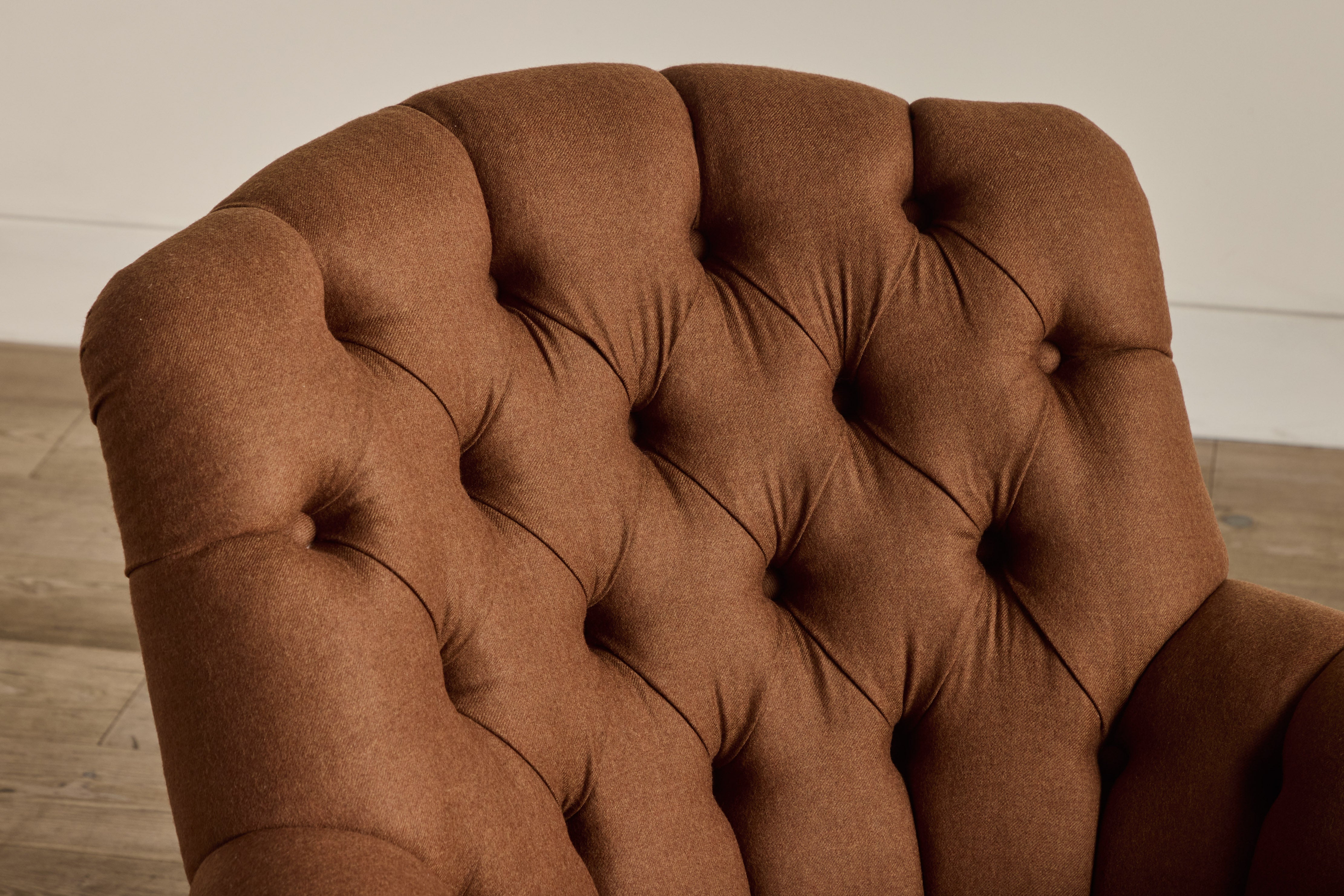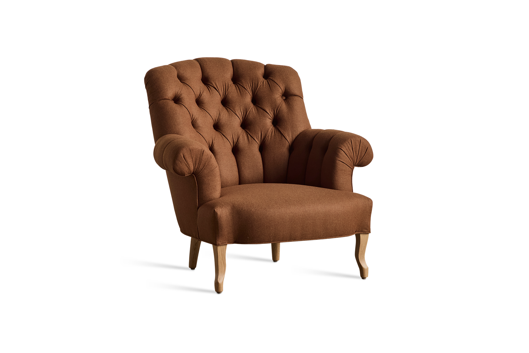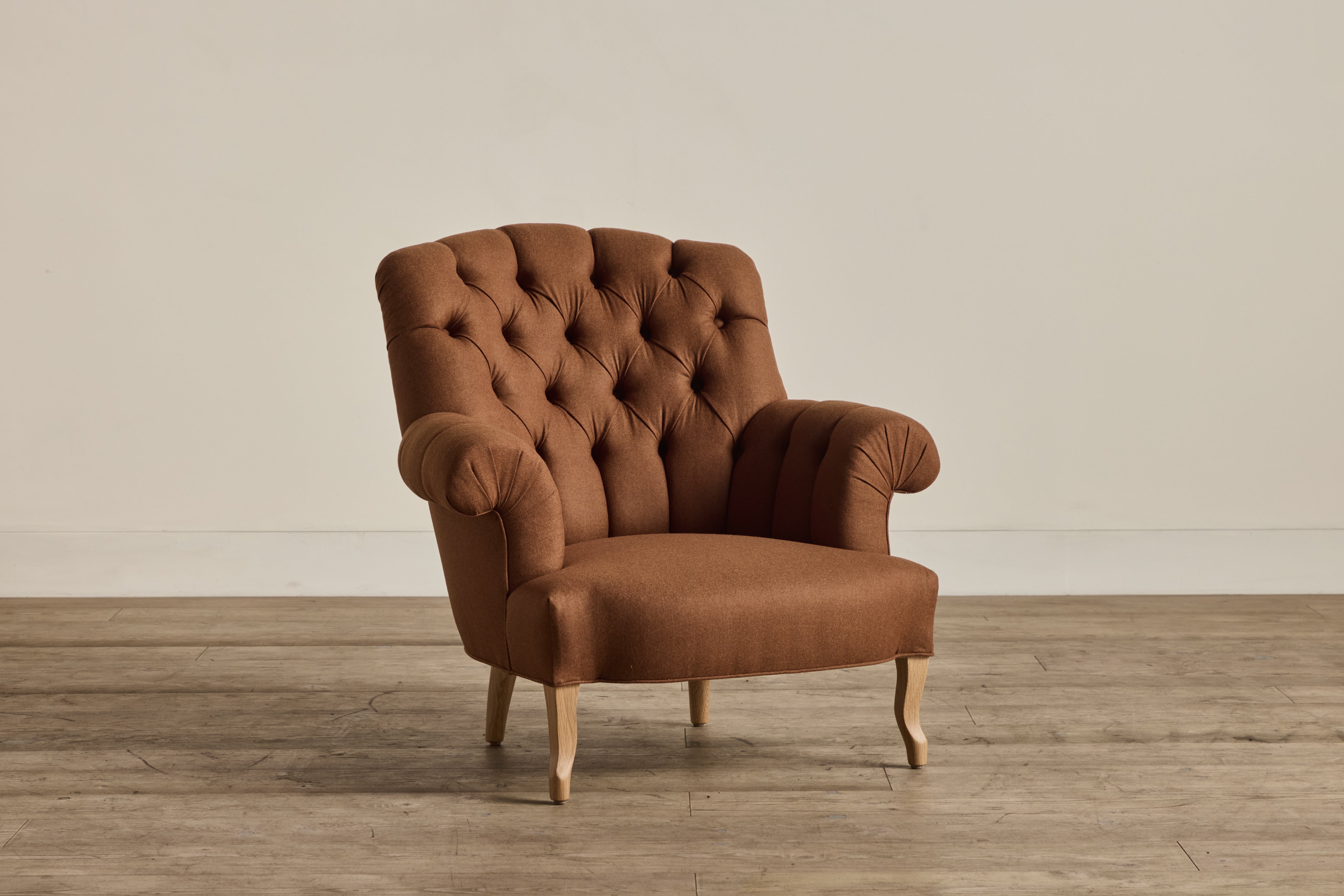 A true heirloom piece. Delightfully feminine as much as it is masculine, this distinct take on a traditional armchair imposes a great presence with a modest footprint. The button-tufted seat back sits upright while leaving plenty of room for comfortable repose. Pair with the matching Library Ottoman for even longer hours of lounging.