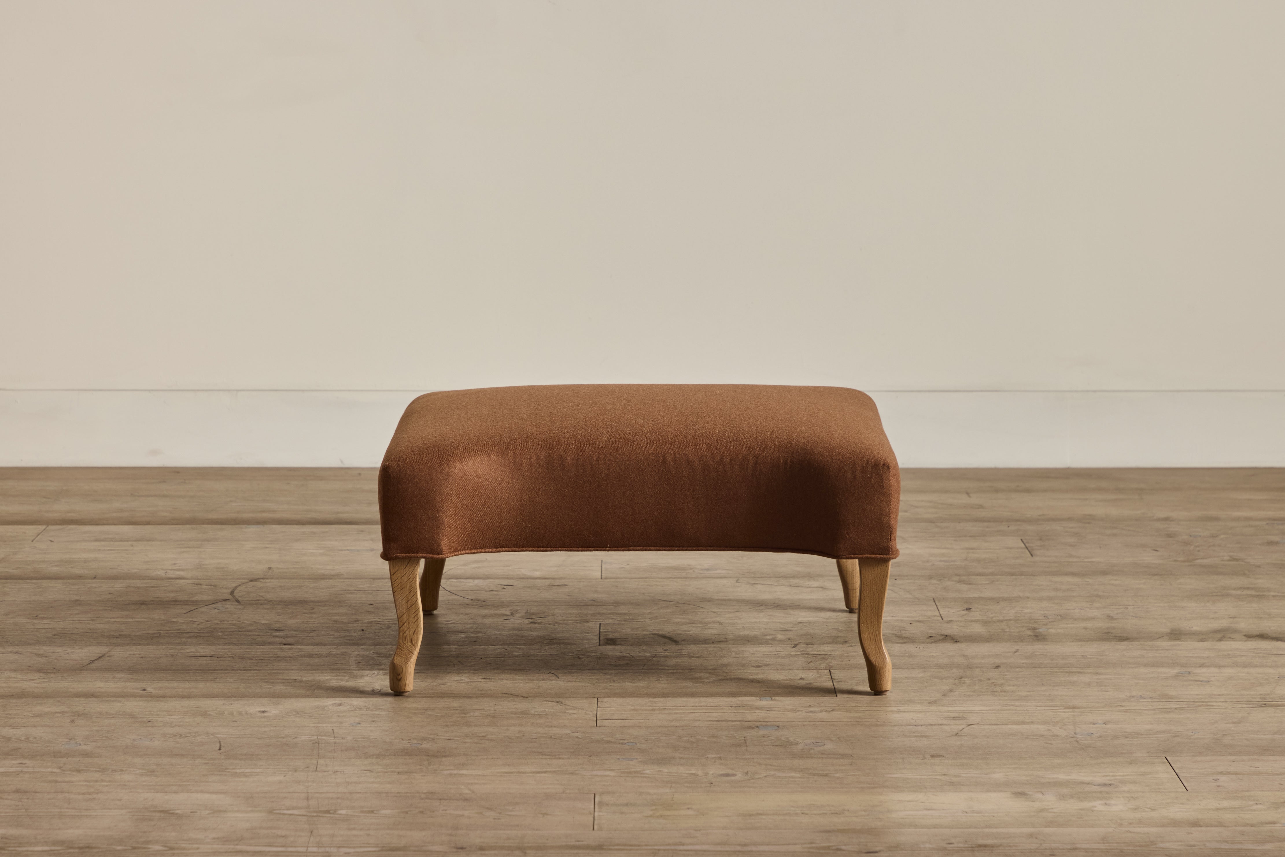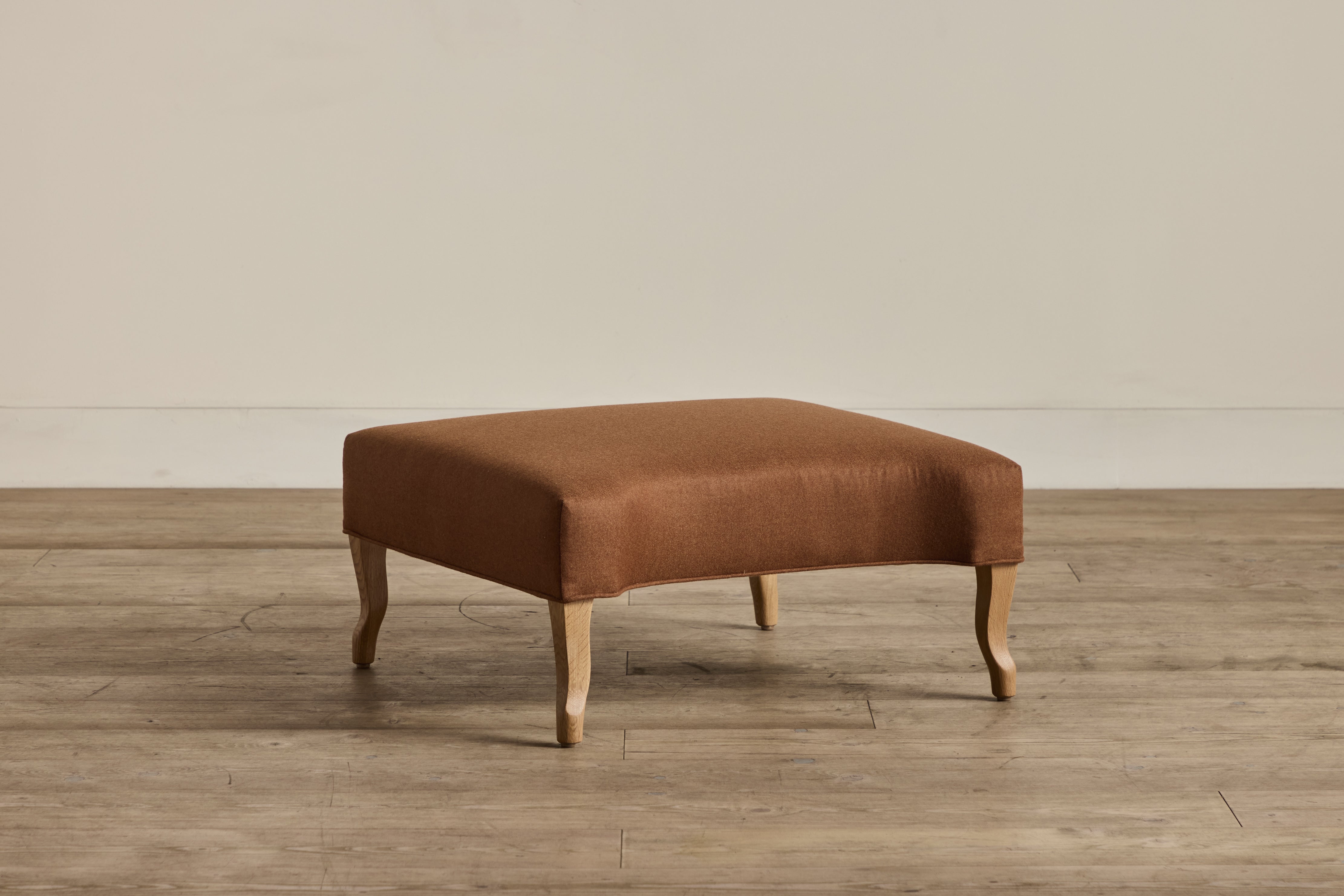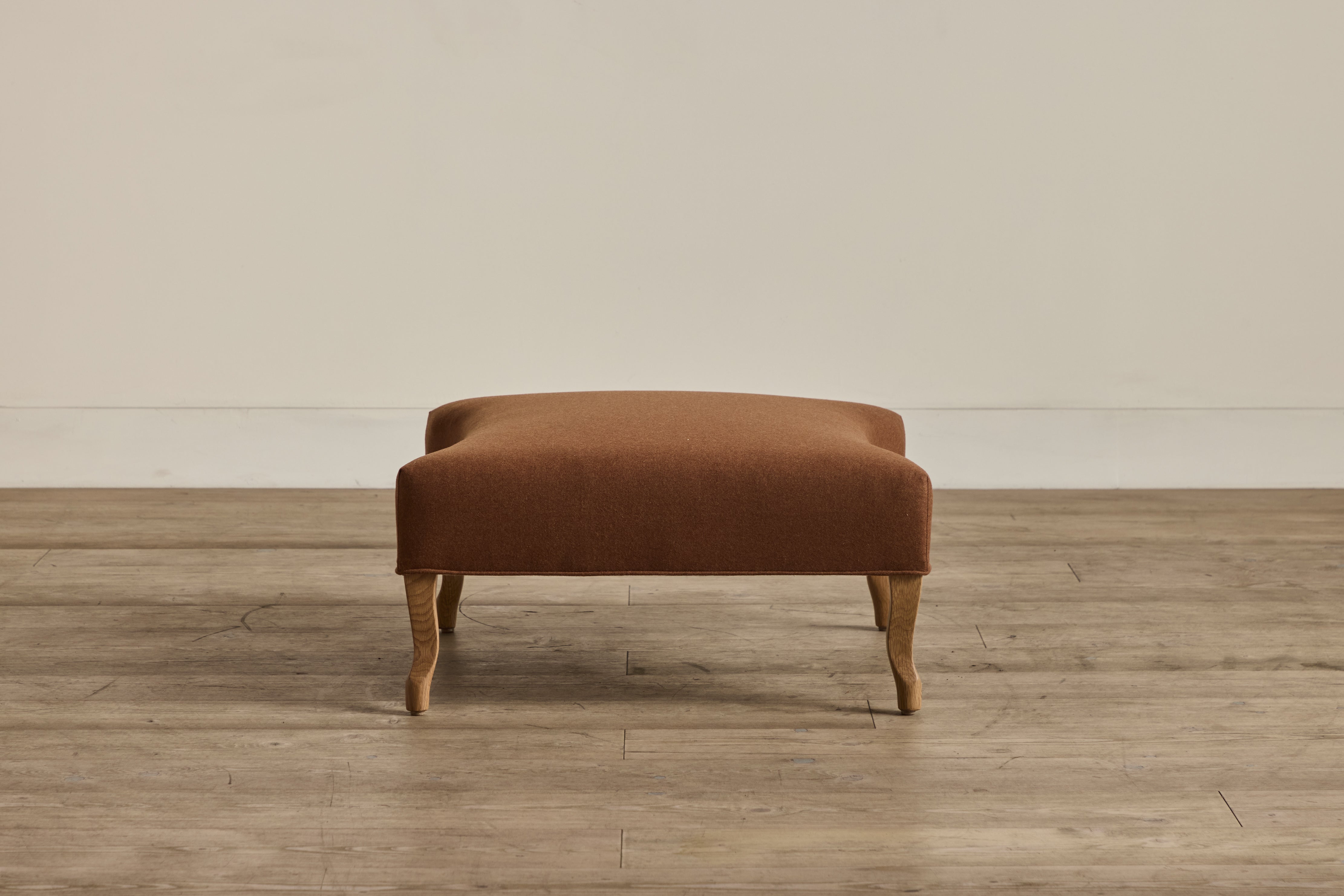 A true heirloom piece. Delightfully feminine as much as it is masculine, this distinct take on a traditional roll armchair ottoman imposes great presence with a modest footprint. Smoothly upholstered and gently scooped to balance the button tufting of its well-read counterpart, the Library Armchair, this handsome ottoman is incredibly specified to the smallest detail.
