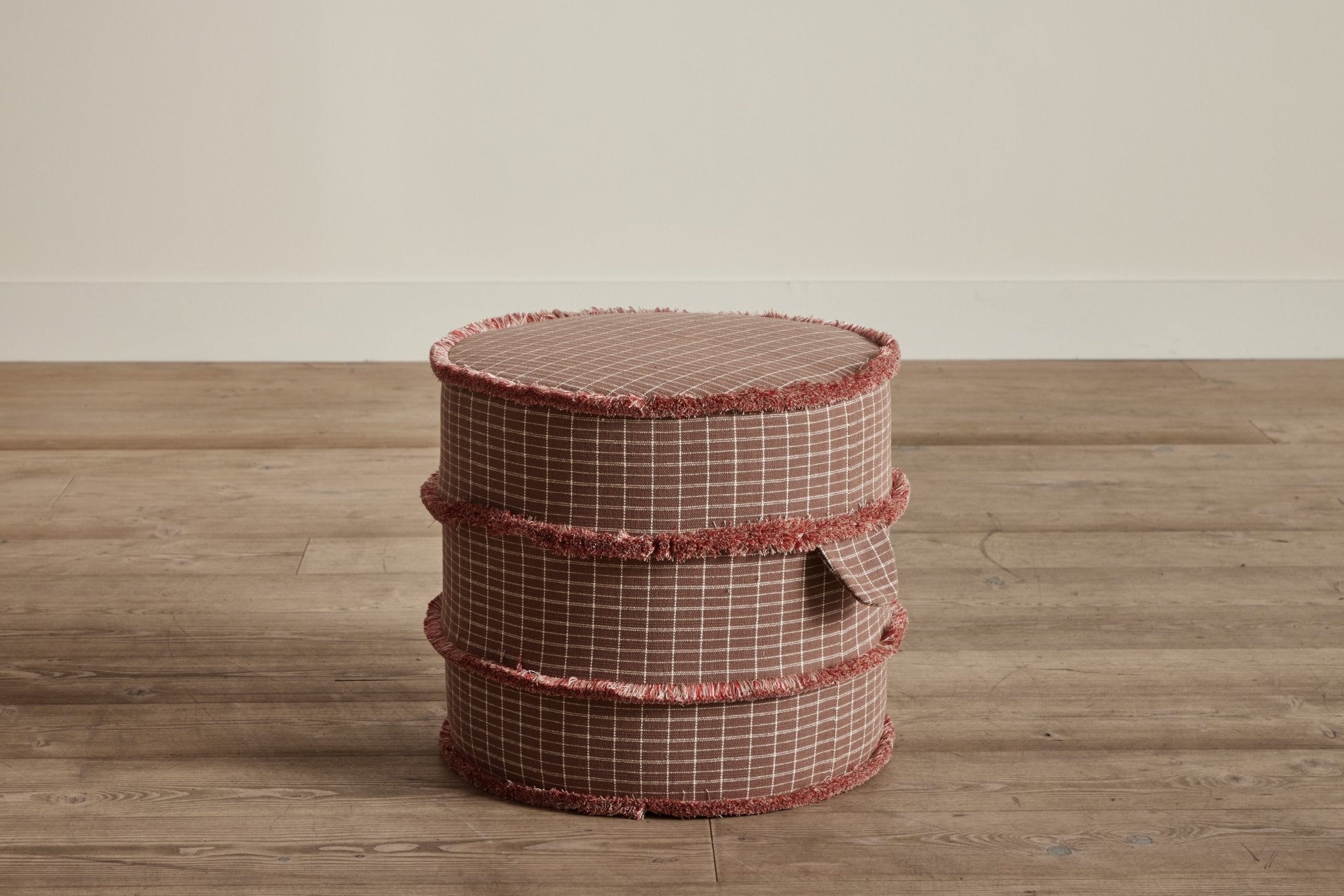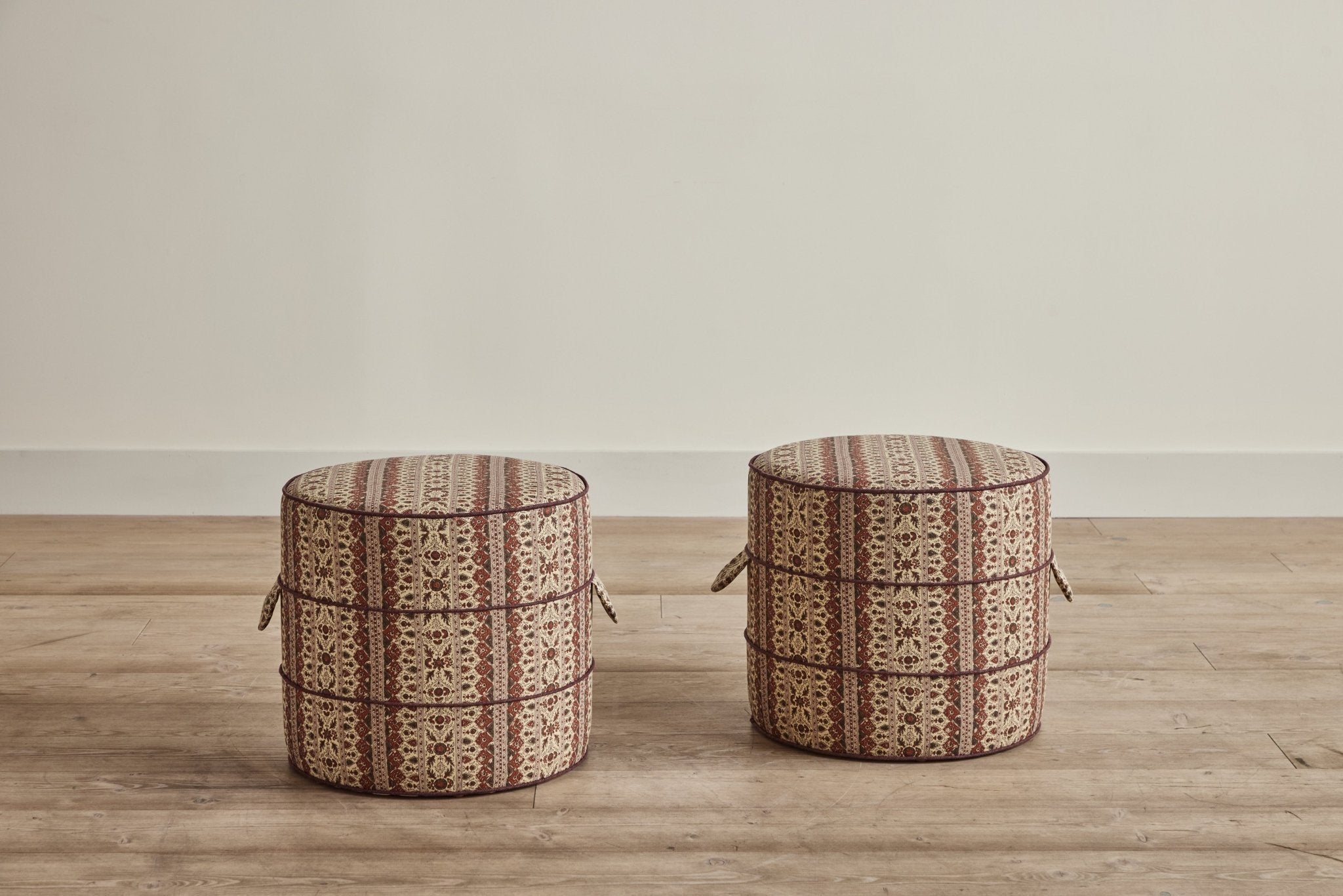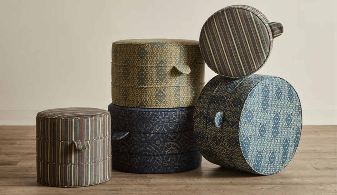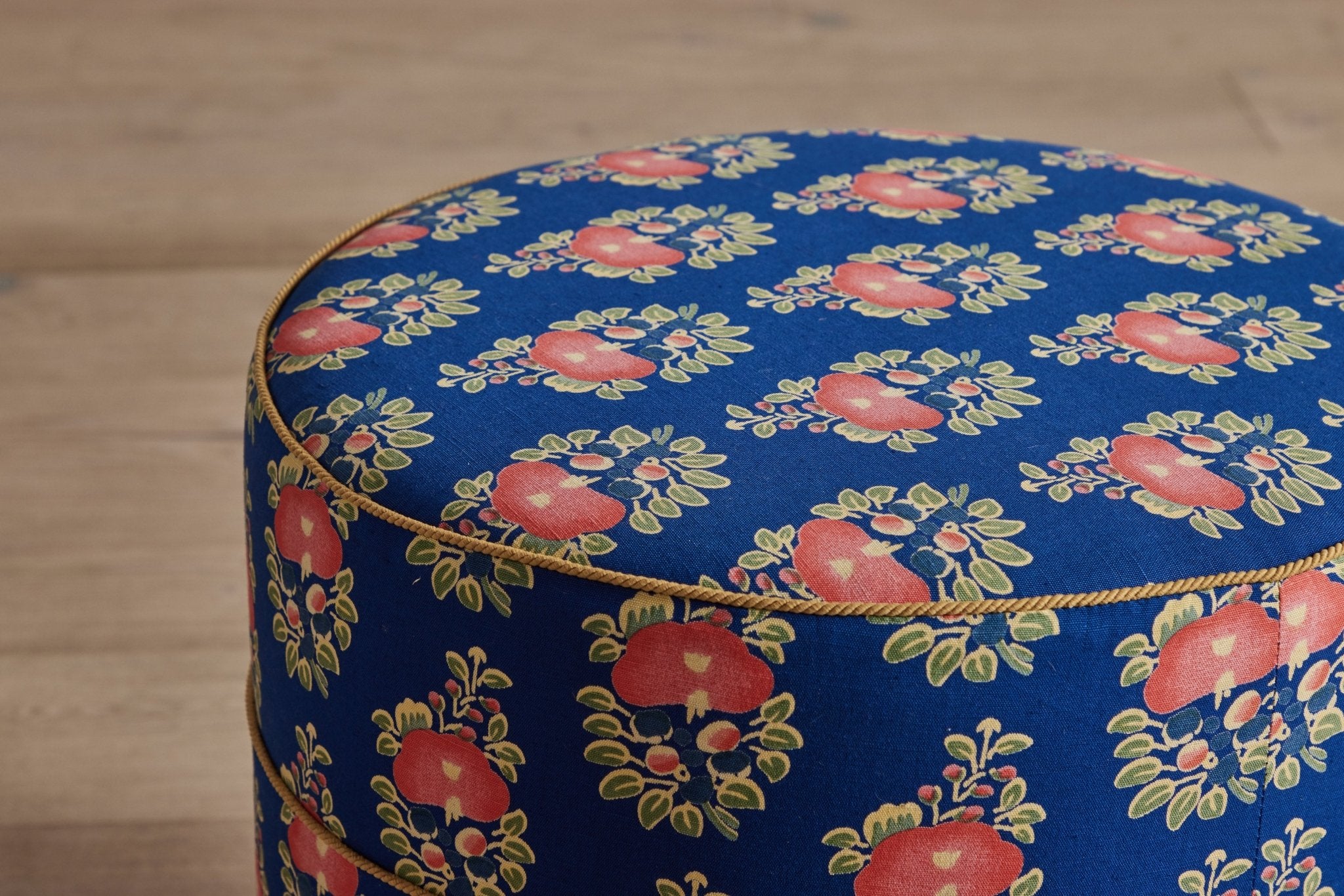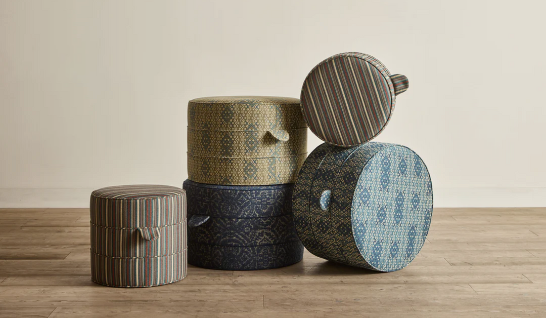 The NK Round Hassock is one of our most talked-about pieces of accent seating, blending the practical and the exotic. A solid wood frame and bold, bright textiles is cleanly defined by two-ring piping and double handle details. Comes in both small, medium, and large.