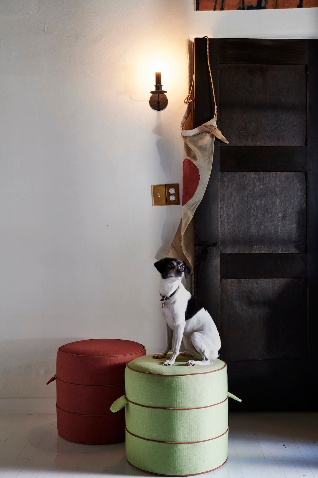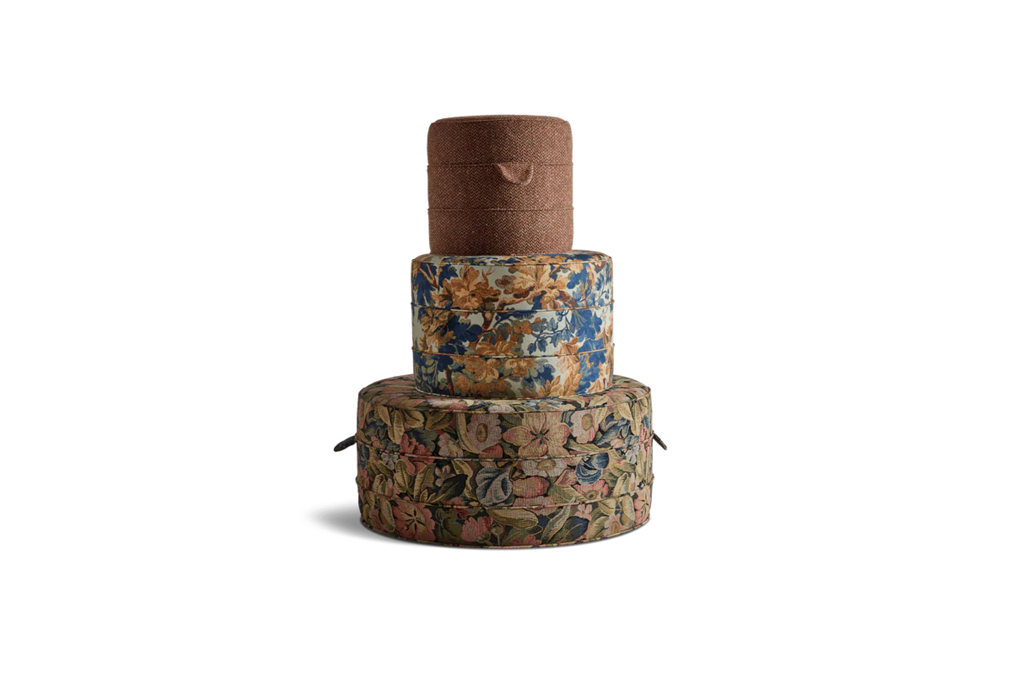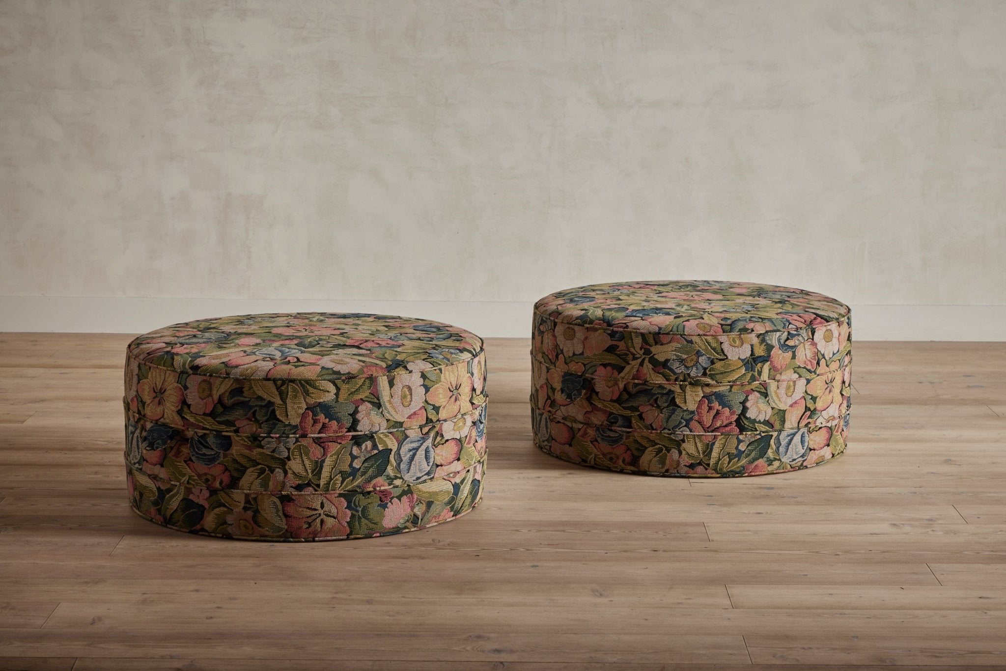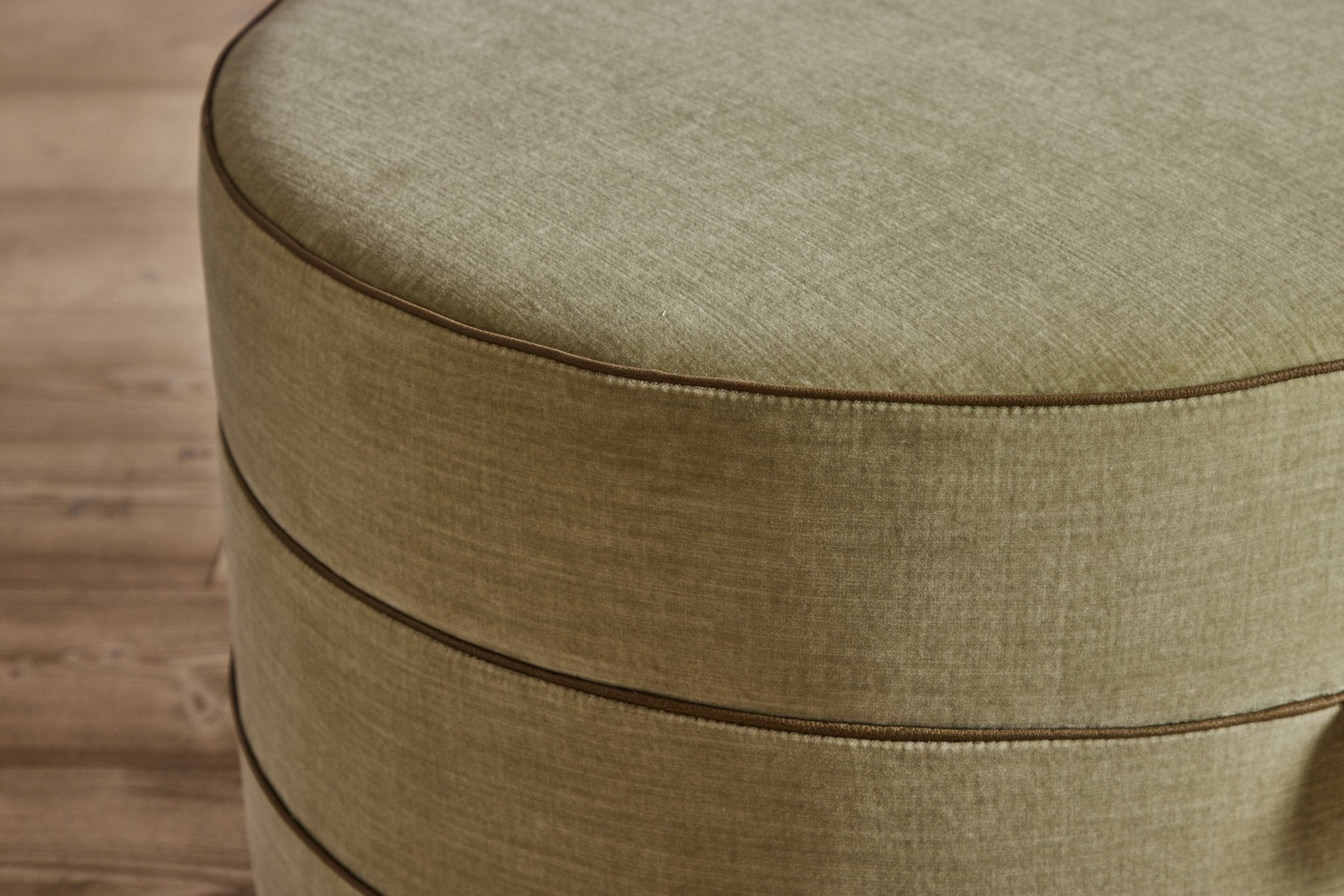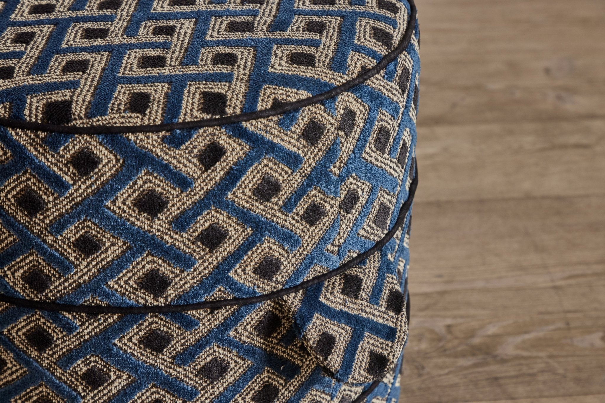 The NK Round Hassock is one of our most talked-about pieces of accent seating, blending the practical and the exotic. A solid wood frame and bold, bright textiles is cleanly defined by two-ring piping and double handle details. Comes in both small, medium, and large.